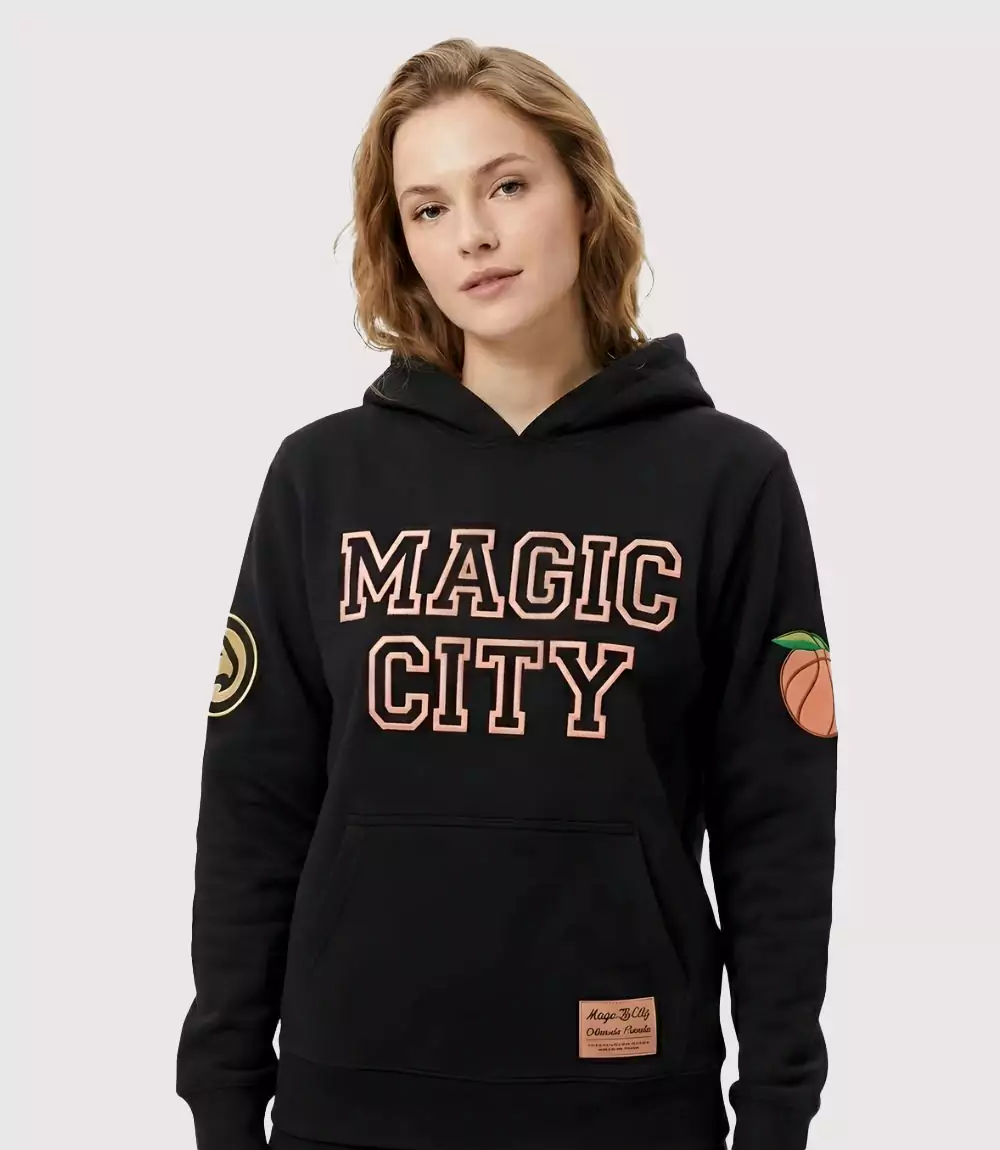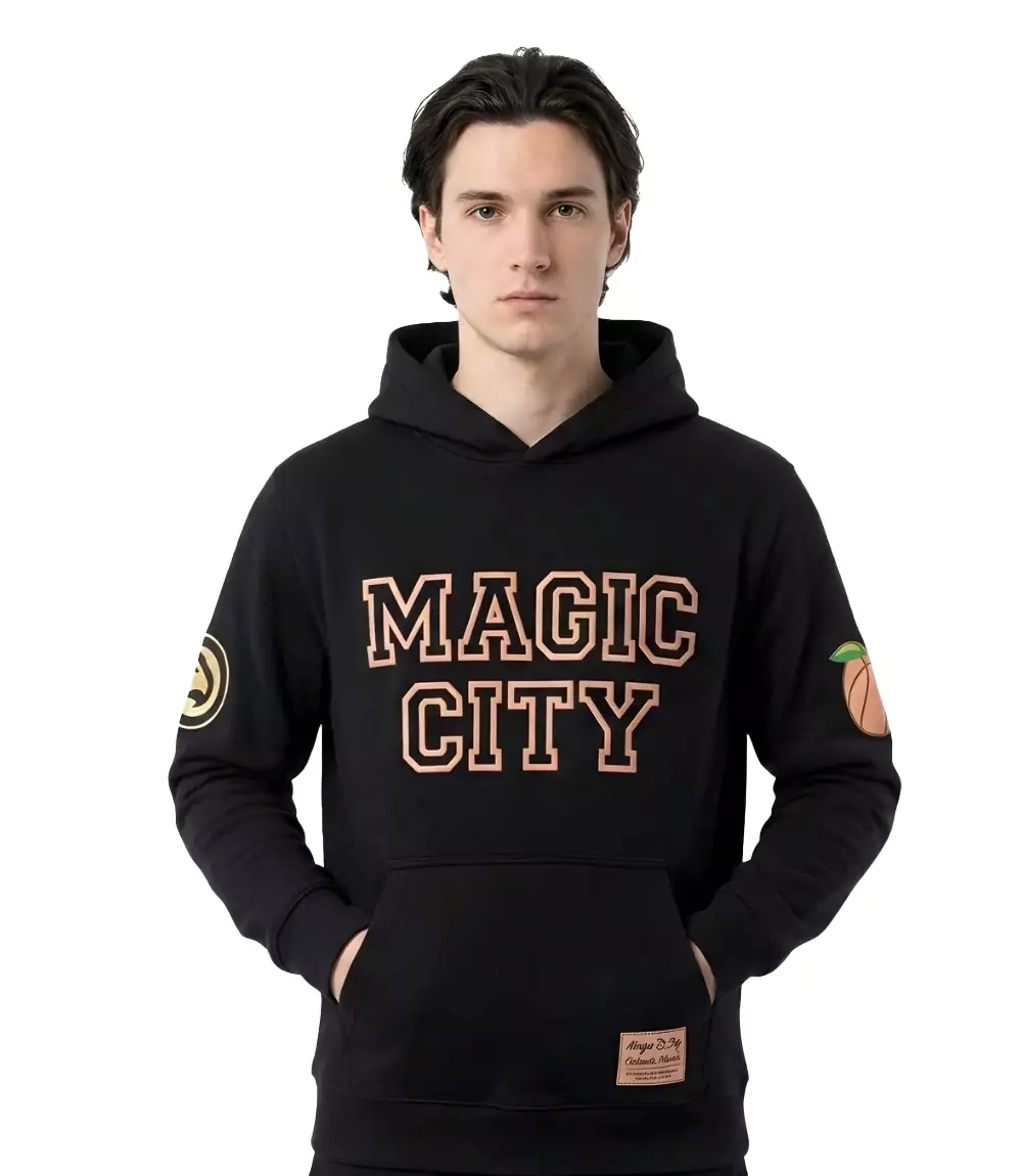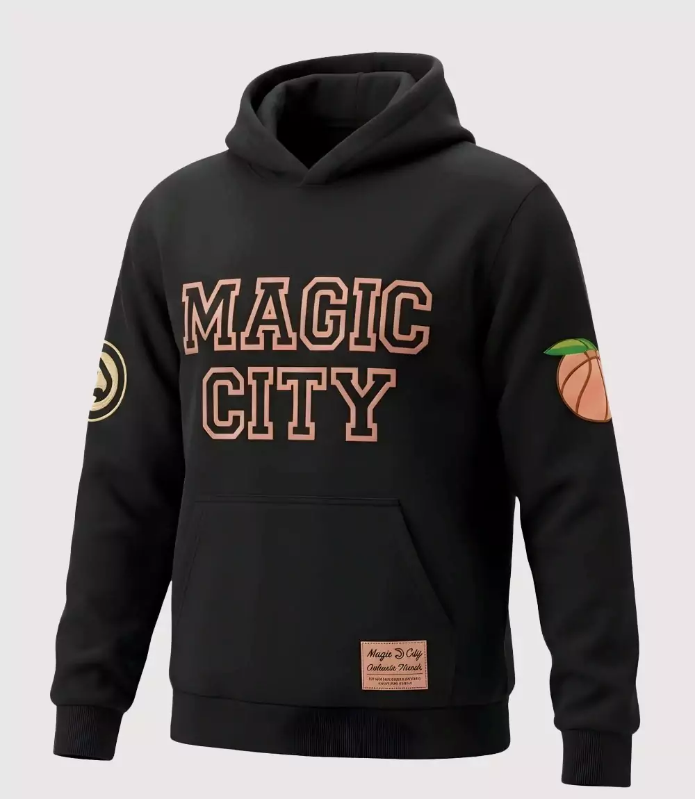 Rendered in a deep, matte black, the hoodie is constructed from a premium, heavy-duty cotton fleece for lasting comfort and warmth. The central design features a bold, collegiate-style “MAGIC CITY” wordmark screen-printed across the chest in a signature peach-toned hue, paying homage to Georgia’s state fruit. The collaborative nature of the garment is further emphasized through detailed sleeve branding; the right sleeve displays a classic Atlanta Hawks logo, while the left sleeve features a stylized basketball transformed into a peach. Functional elements include a spacious kangaroo front pocket, rib-knit cuffs, and a specialized “Magic City Authentic Merch” woven jock tag at the lower hem, ensuring its status as a premium collectible.
