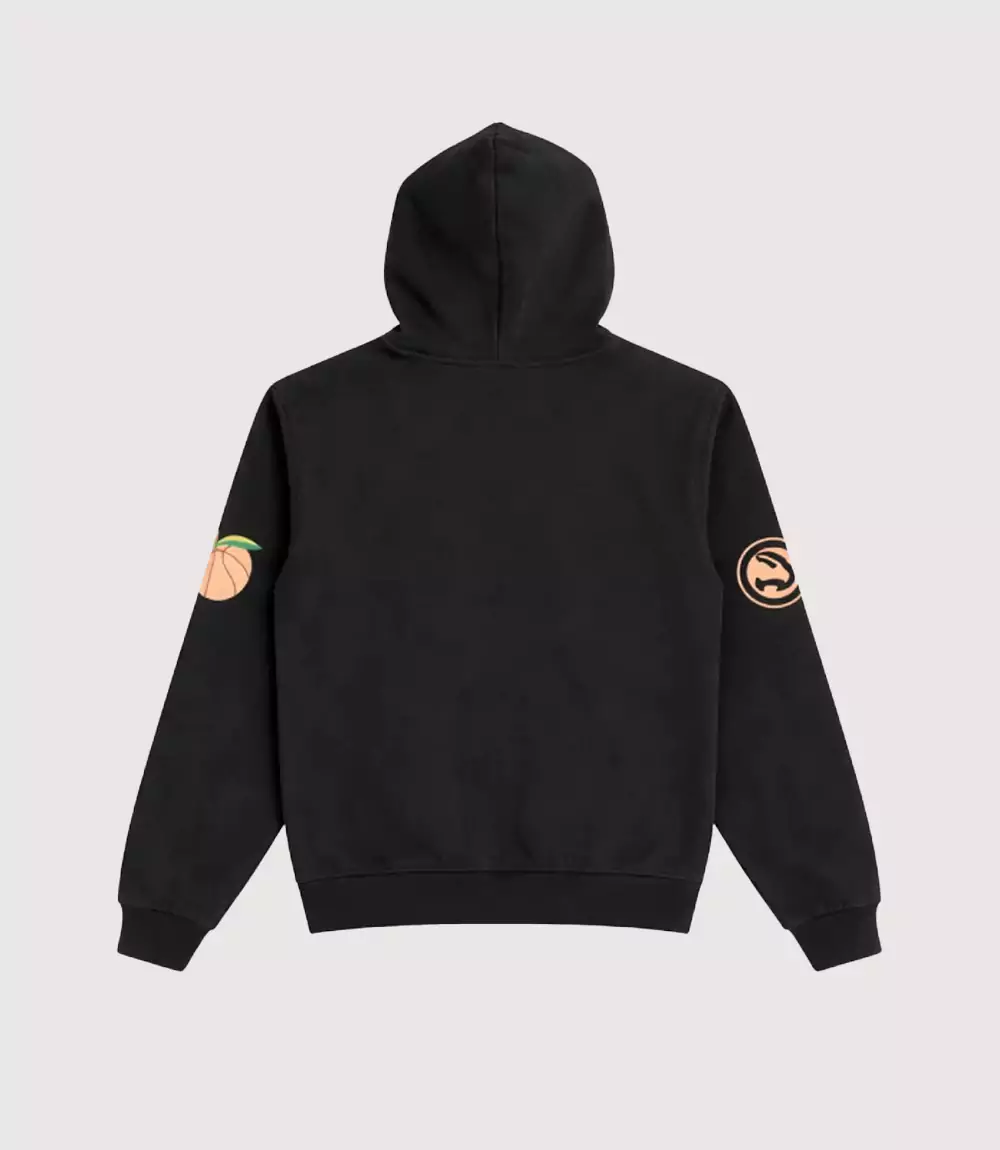 A : The peach on the left sleeve of the Atlanta Hawks Peach Graphic Hoodie serves as a dual symbol for Georgia (“The Peach State”) and a playful nod to the famous culinary items often associated with Atlanta’s local culture.