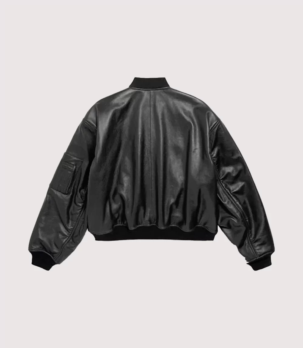 The Balenciaga Lambo Shield Bomber is defined by its exaggerated oversized proportions and premium black leather construction that exudes a tactical, high-gloss finish. The focal point of the design is the gold-and-black Automobili Lamborghini shield prominently displayed on the chest, underlined with the Balenciaga wordmark a powerful symbol of Luxury Italian Supercar Collaboration Outerwear. knitedge ensures that every detail of this Black Balenciaga Lamborghini Flight Jacket reflects elite craftsmanship, from the heavy-duty metal zipper to the utility flight pocket on the left sleeve and the structural rib-knit trim at the collar, cuffs, and hem. This jacket isn’t just clothing; it’s a piece of Premium Co-Branded Automobili Lamborghini Apparel designed for the modern fashion vanguard.