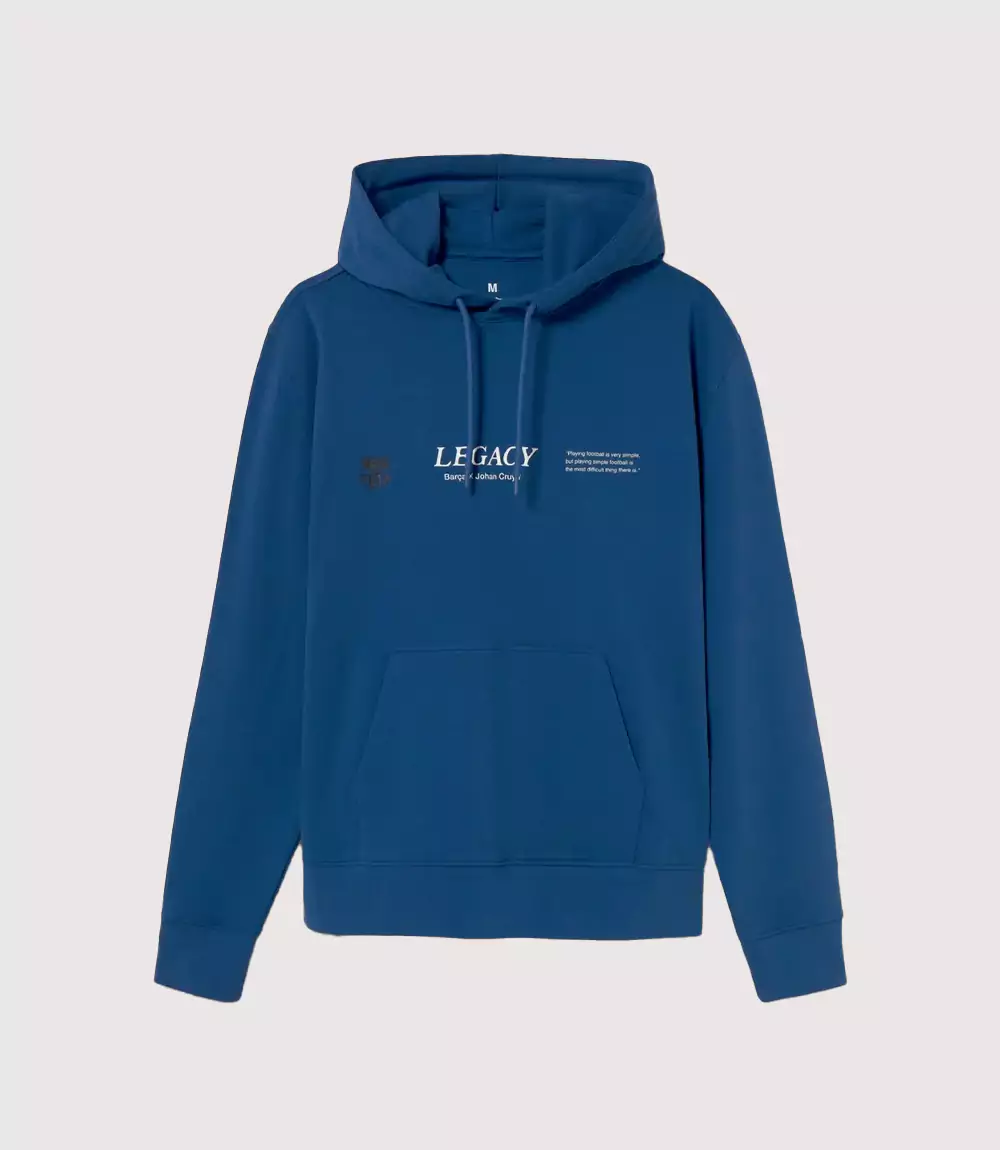The garment is presented in a deep, classic Blaugrana blue, constructed from a premium mid-weight cotton blend that offers a smooth, structured finish. The central focus is the “LEGACY” text in a sharp, white serif font, immediately followed by “Barça x Johan Cruyff” in a smaller, clean typeface. To the right of the main title, the hoodie features one of Cruyff’s most famous quotes: “Playing football is very simple, but playing simple football is the most difficult thing there is.”. At knitedge we appreciate the inclusion of the tonal FC Barcelona crest on the right chest, maintaining the Blue Minimalist Barça Sweatshirt aesthetic. With its functional kangaroo pocket, color-matched drawstrings, and ribbed cuffs, this FCB Legacy Collection Apparel is an essential for fans who appreciate the deeper history of the beautiful game.