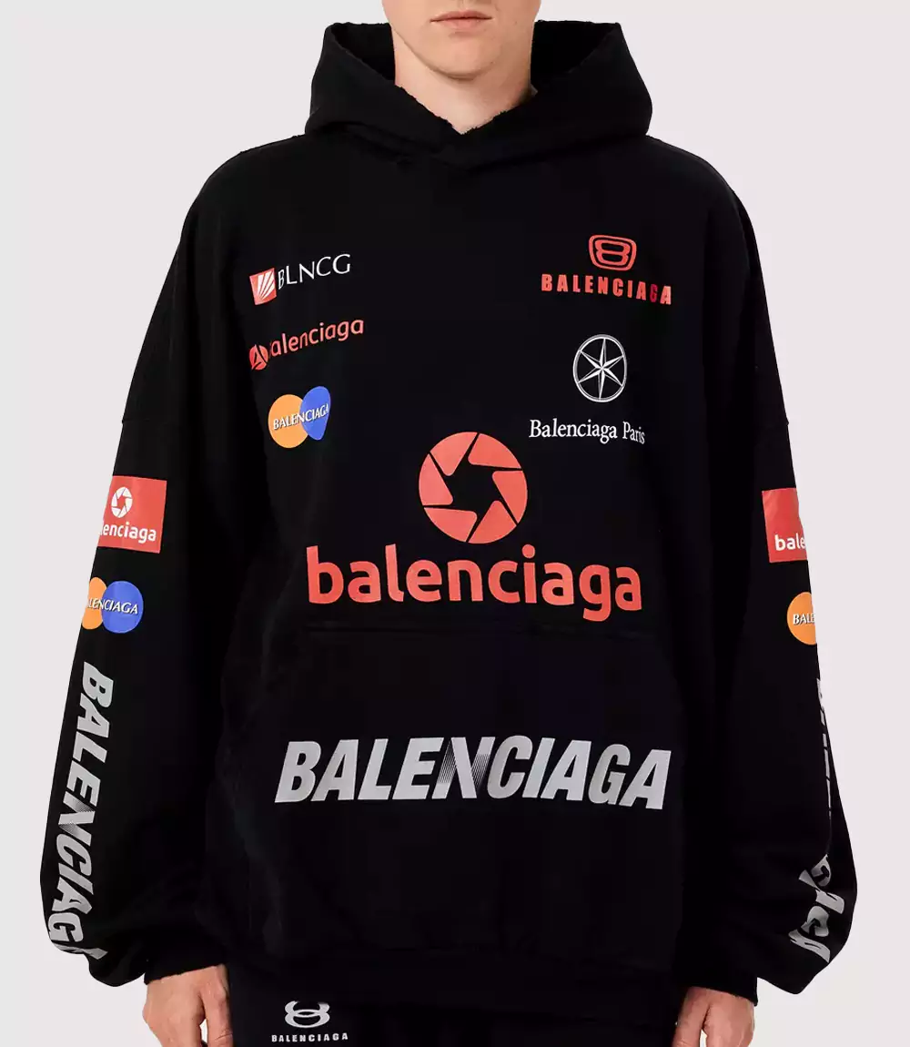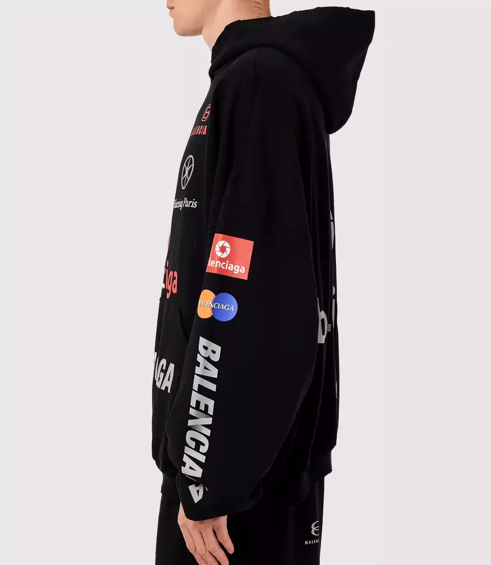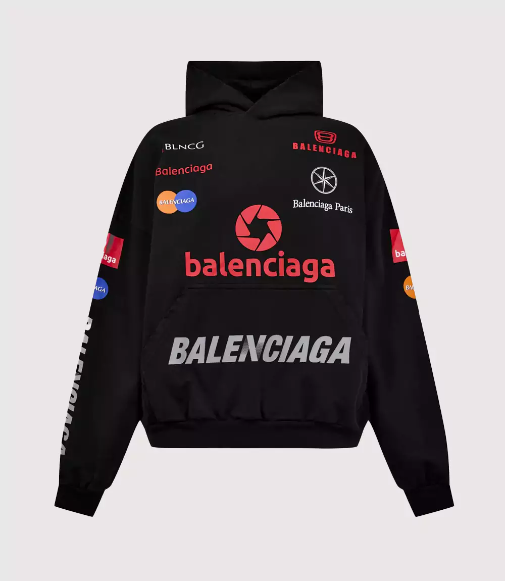 The Balenciaga Multi-Logo Hoodie Black is a definitive piece of modern luxury that showcases Demna Gvasalia’s signature approach to recontextualizing everyday corporate imagery. Draped in a deep, washed black, this hoodie features a chaotic yet intentional arrangement of various logos, including “BLNCG,” “Balenciaga Paris,” and several circular geometric motifs that mimic professional corporate identities. At knitedge we recognize this garment as a masterclass in the “Racing” and “Corporate Core” aesthetics that are dominating the 2026 luxury streetwear landscape.