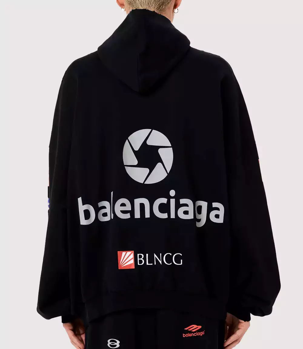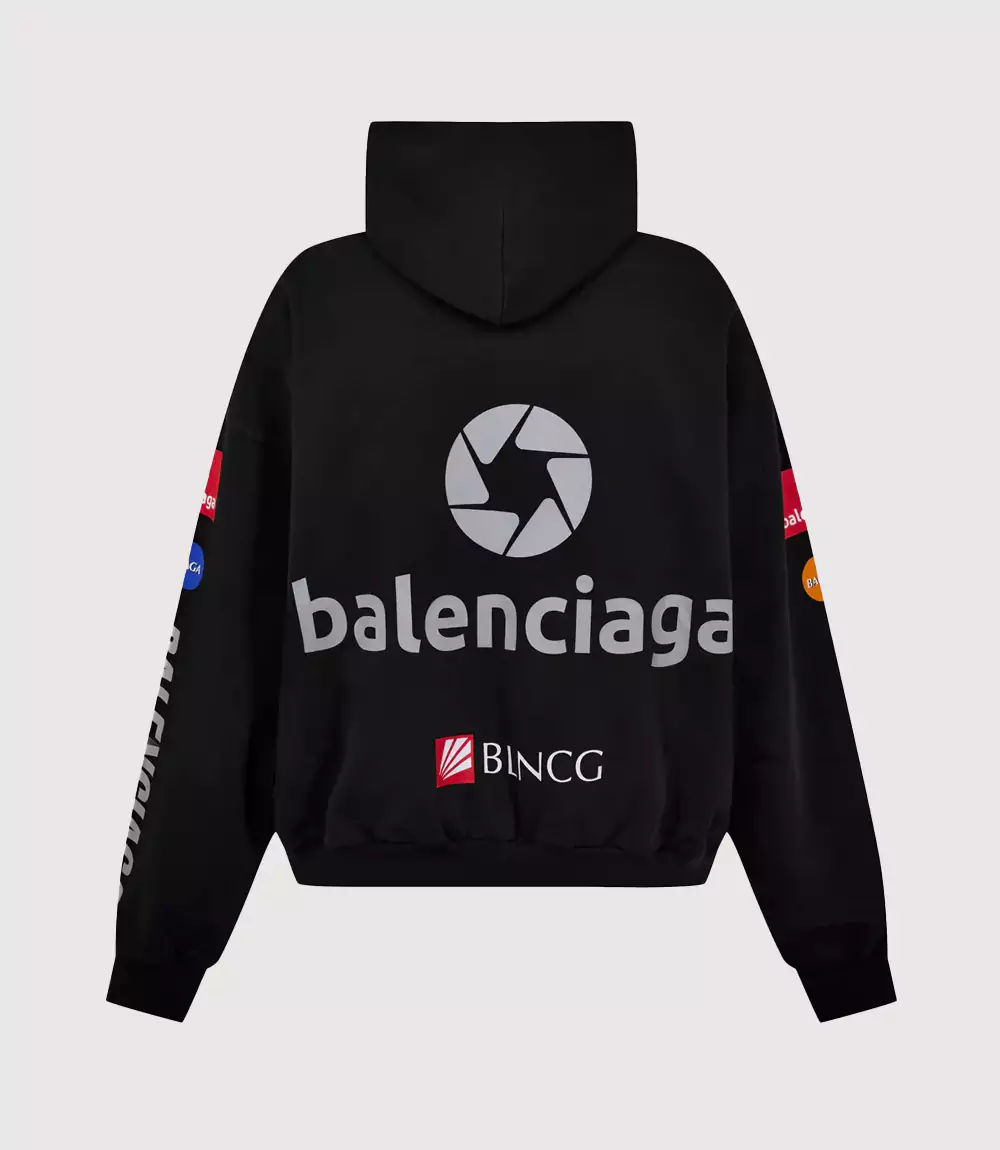 The visual identity of this Balenciaga Corporate Graphic Hoodie is defined by its maximalist use of high-contrast prints. The front is adorned with a large, central red aperture-style logo, while the sleeves and back are heavily printed with white and red typography and Mastercard-inspired color spheres. knitedge highlights the back of the Black Balenciaga BLNCG Sweatshirt, which features a massive reflective or high-contrast “Balenciaga” wordmark, ensuring the piece is instantly recognizable from any angle.