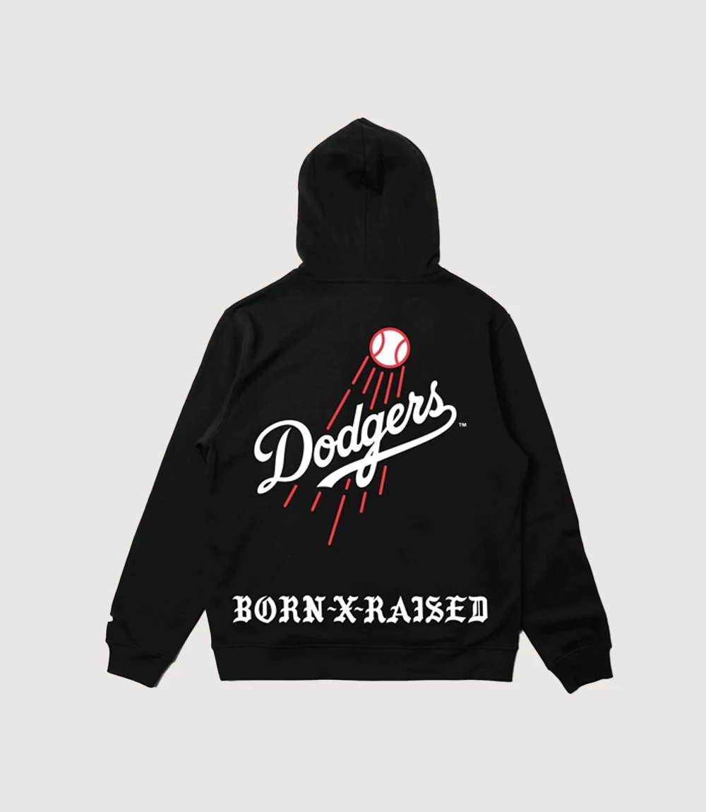 Sleek black hoodie with bold Born X Raised Dodgers logo.