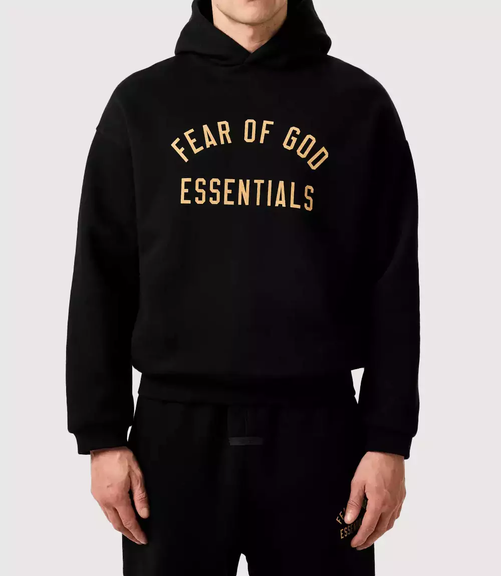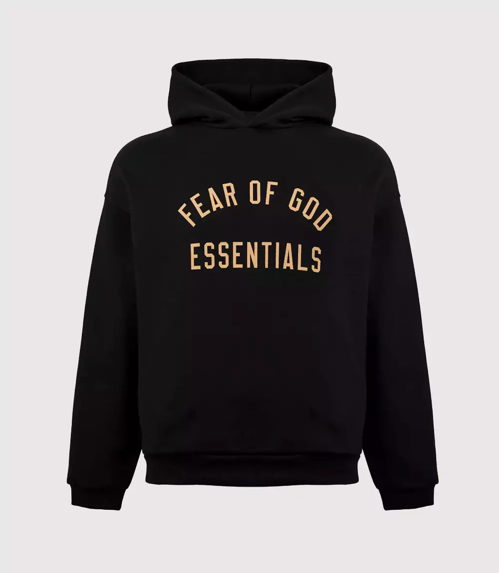 The aesthetic standout of this FOG Essentials Core Black Pullover is the oversized “FEAR OF GOD ESSENTIALS” graphic emblazoned across the chest. Unlike the tonal applications of previous seasons, this Essentials Gold Logo Black Hoodie utilizes a metallic gold or tan-hued typeface that adds a layer of prestige to the monochromatic design. knitedge notes the brand’s commitment to clean lines, evidenced by the absence of drawstrings and the inclusion of a subtle, rubberized logo patch on the crown of the hood, which confirms its identity as a premium Jerry Lorenzo Essentials Streetwear staple.