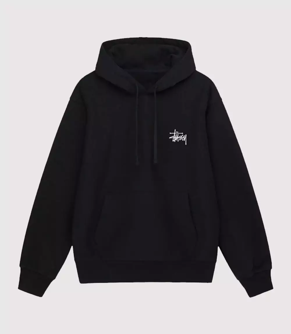 The hoodie is constructed from a heavyweight cotton-poly blend fleece, providing a structured, durable exterior and a soft, plush interior for maximum warmth. The primary design feature is the Stüssy Stock Logo, delicately embroidered in a high-contrast white thread on the left chest. This minimalist branding allows the quality of the garment’s construction to take center stage. The piece features a double-lined hood with tonal round drawstrings, a spacious kangaroo pocket and heavy-duty ribbing at the cuffs and hem to ensure the oversized, boxy fit maintains its shape over time. As a centerpiece of the Classic Black Stüssy Fleece line, this hoodie remains a must-have for those seeking an authentic, timeless streetwear look.