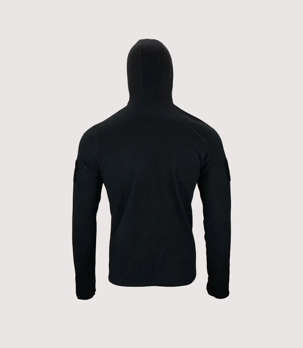 The tactical design of this Black Operator Fleece prioritizes protection and adaptability in the field. It features a high-coverage hood with an integrated neck gaiter style collar, providing an extra barrier against wind and cold. knitedge notes the inclusion of a tonal hook-and-loop (Velcro) patch on the left upper arm, allowing for the discrete attachment of identification or unit patches without breaking the sleek, monochromatic look of the Tactical Stealth Hoodie.