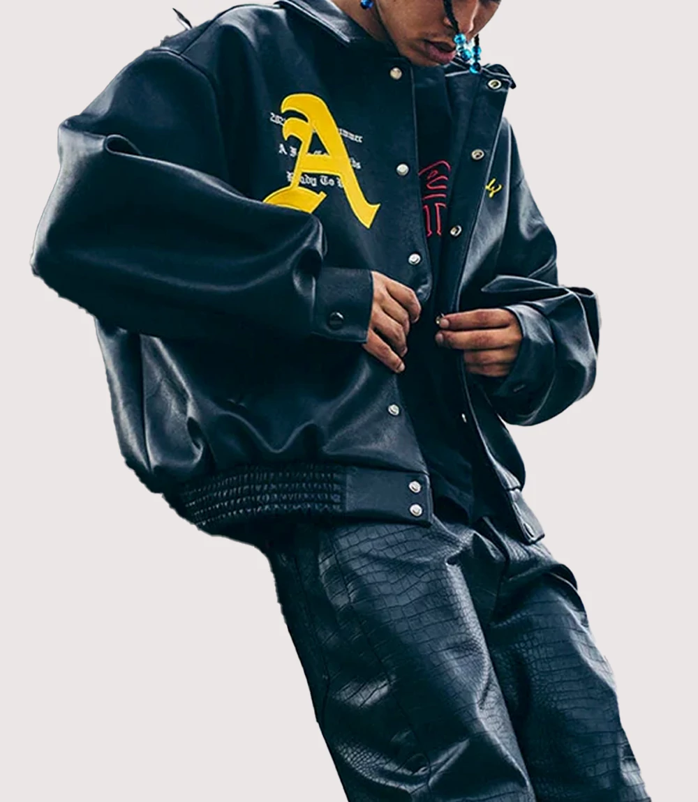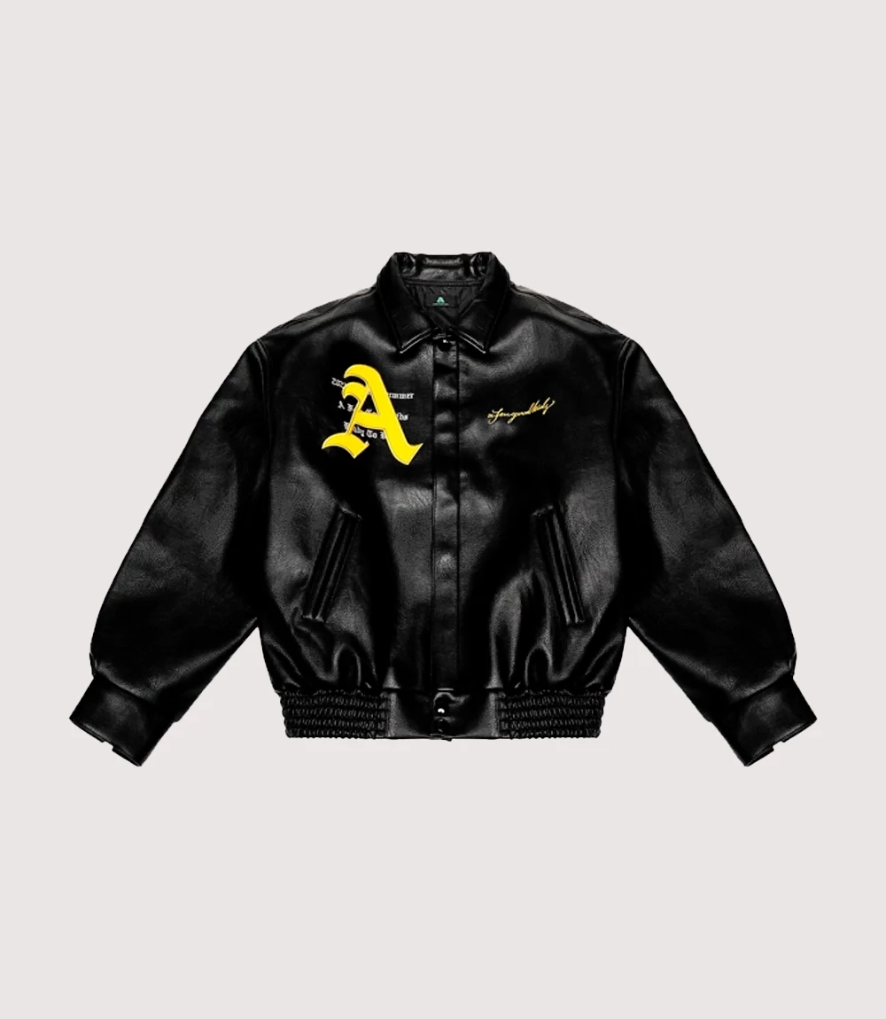 A : The large yellow logo on the Premium AFGK Yellow “A” Logo Leather jacket is a high-density leather appliqué patch. This ensures the logo maintains its vibrant color and structural integrity over time, unlike standard screen printing.