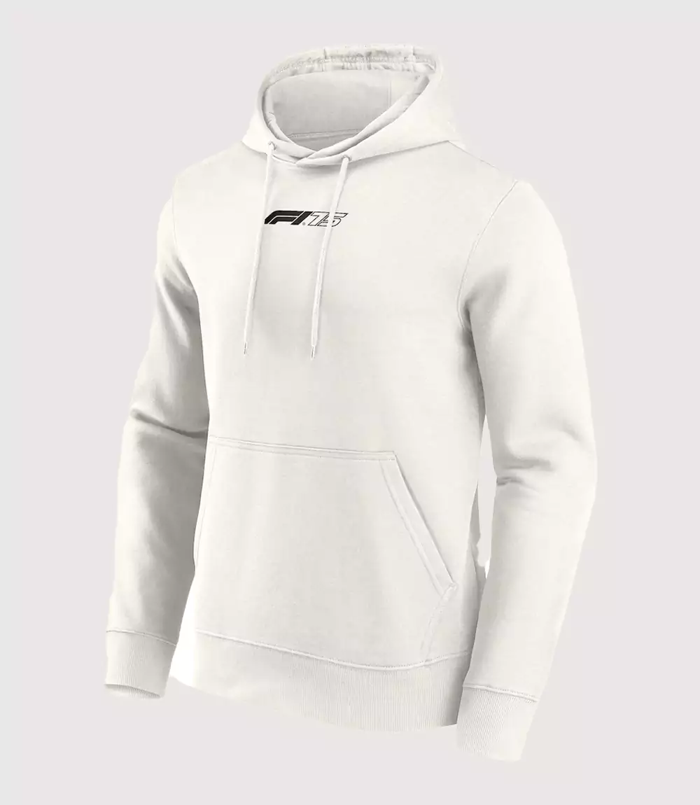 A : The “F1 75” logo on the chest signifies Formula 1’s 75th anniversary season. It is a key element of the F1 75th Anniversary Hoodie, marking it as a collectible piece of racing history. The branding is kept minimal to maintain the Minimalist Formula 1 White Sweatshirt look.