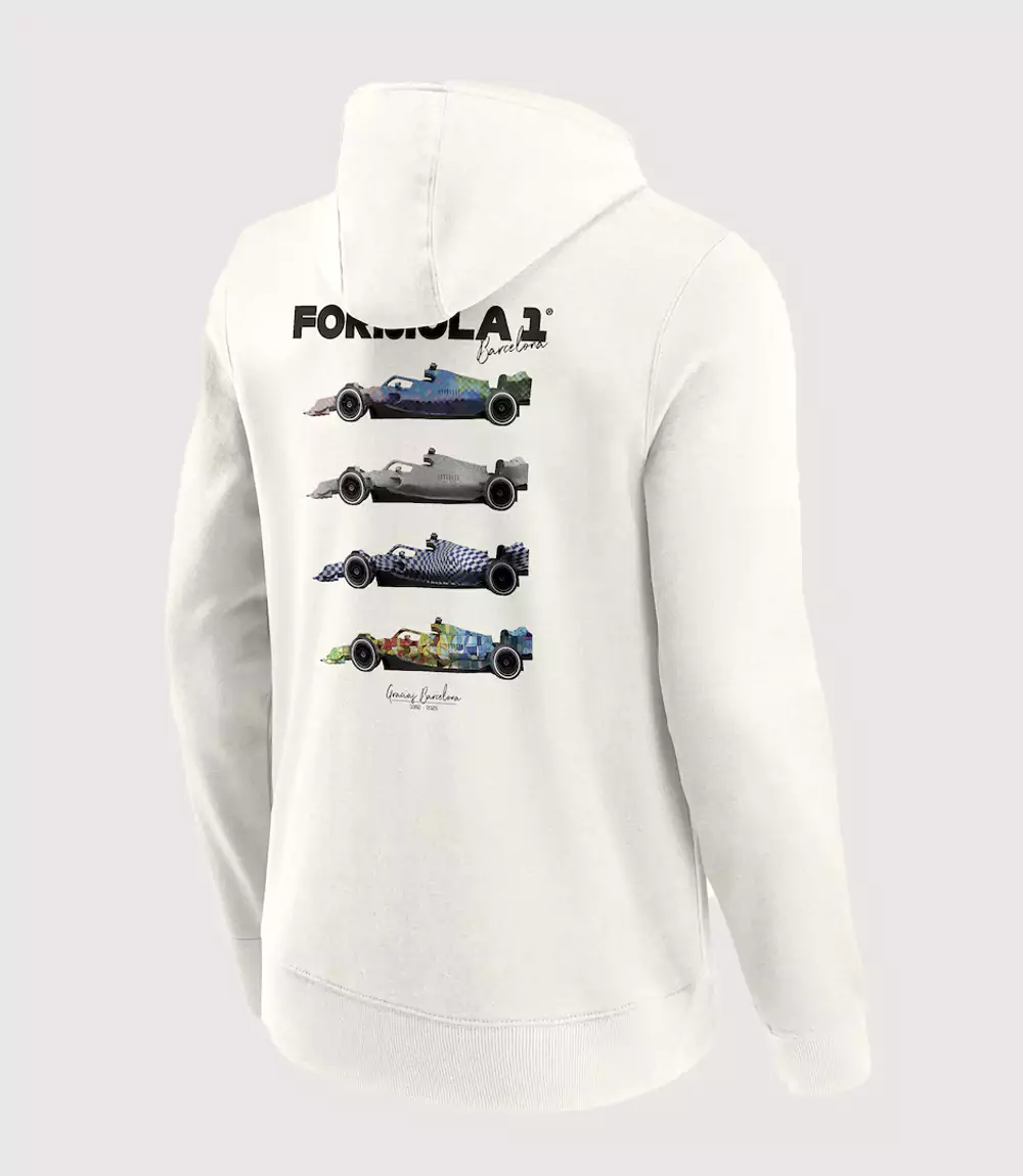 Rendered in a crisp, optic white, the hoodie serves as a bright canvas for the primary graphic. The center chest features a sharp, black-and-white “F1 75” logo, referencing the sport’s historic 75th anniversary. While the front remains understated, the F1 Barcelona Circuit Hoodie often incorporates mosaic-inspired graphics on the back or sleeves that celebrate the vibrant artistic history of Barcelona. Constructed from a soft, mid-weight cotton-poly blend, this Minimalist Formula 1 White Sweatshirt features a classic kangaroo pocket, adjustable drawstrings, and ribbed cuffs for a secure athletic fit. Whether you are a lifelong fan or a new follower of the grid, this Official F1 Racing Apparel is an essential piece of Motorsport Inspired Graphic Hoodie design.