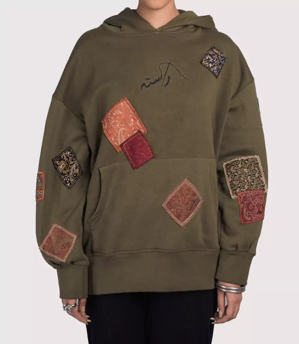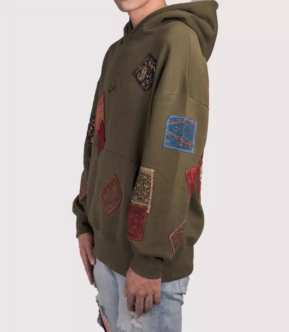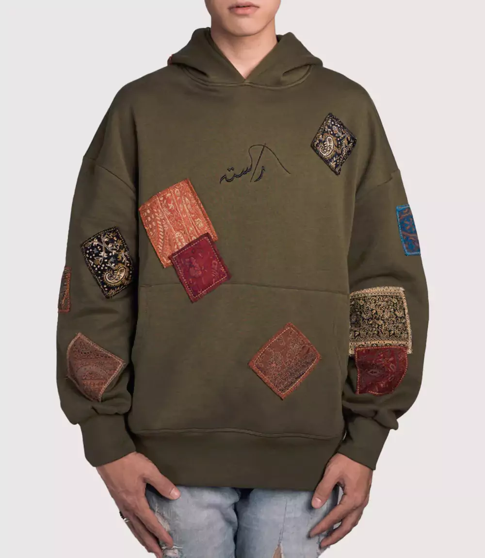 The Rasta Patchwork Hoodie Olive is a visually arresting piece that celebrates cultural storytelling through high-end textile art. Draped in a rich olive green earth tone, this Olive Green Artisan Hoodie serves as a sophisticated canvas for a series of intricate fabric applications. At knitedge we highlight this Traditional Fabric Patchwork Pullover for its unique ability to combine raw urban silhouettes with the delicate elegance of traditional South Asian and Middle Eastern patterns.