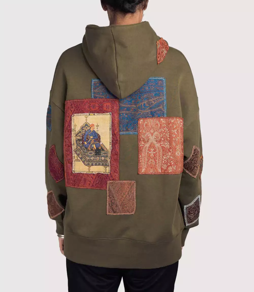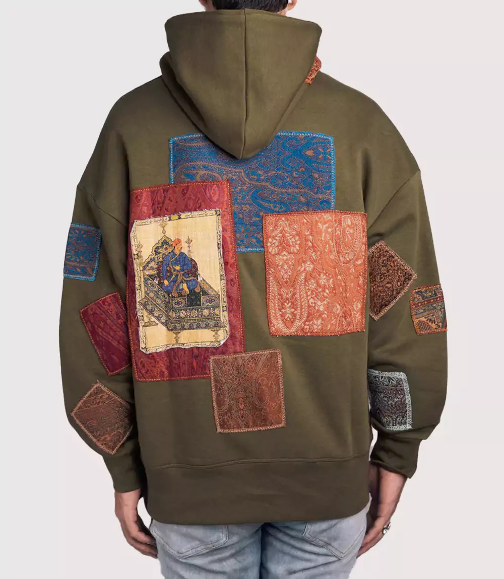 The defining characteristic of this Rasta Embroidered Calligraphy Hoodie is the delicate script embroidery on the center chest, which adds a personal, artisanal touch to the garment. Surrounding this are multiple diamond-shaped patches featuring diverse paisley and floral motifs, each hand-placed to create a balanced, asymmetrical aesthetic. On the reverse, the Mughal Art Inspired Streetwear truly shines, featuring a large central tapestry patch depicting a royal figure seated on a throne, surrounded by larger rectangular fabric panels in contrasting rust and indigo shades. This Hand-Stitched Aesthetic Olive Sweatshirt ensures that you make an impact from every angle.