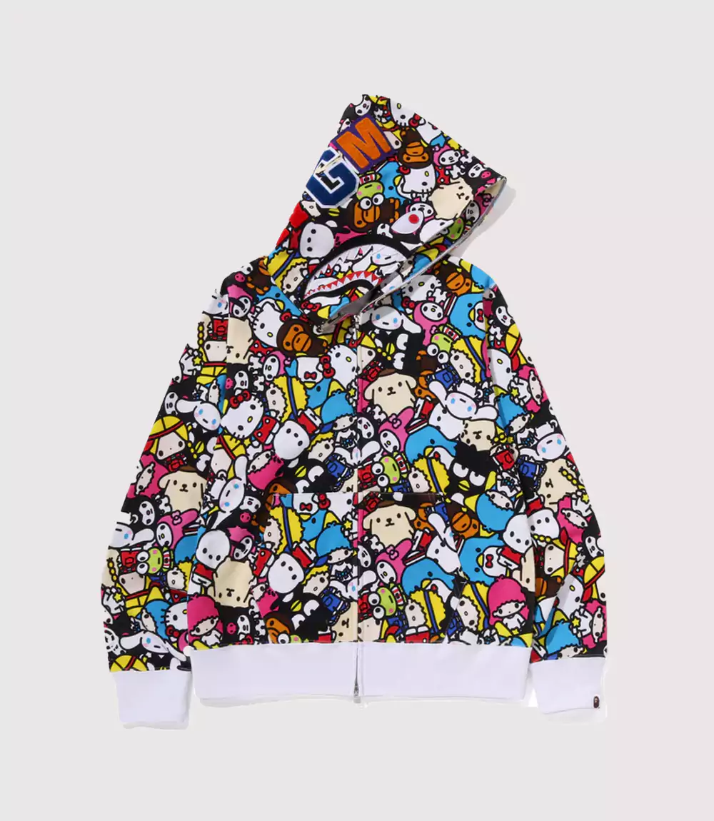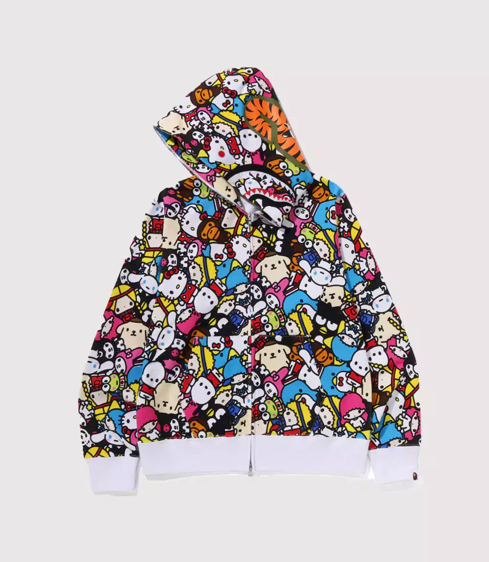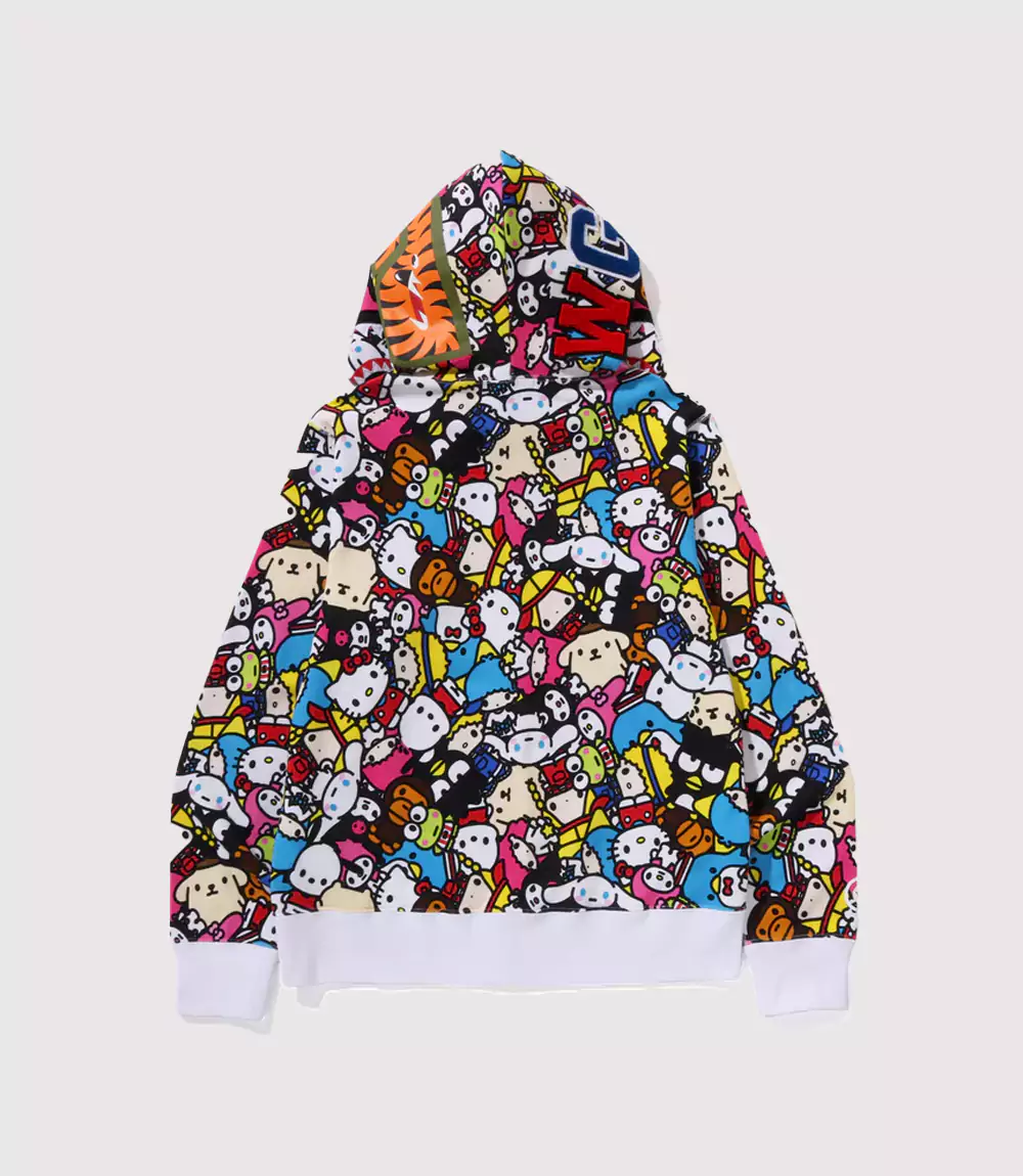 Constructed from premium, heavy-fleece cotton, this Multi-Character Sanrio BAPE Pullover is built to the rigorous standards of Japanese streetwear. The full-zip functionality allows for versatile styling, whether worn fully closed for the signature “Shark” look or open to showcase a layered ensemble. knitedge emphasizes the professional quality of the screen-printed characters, which are designed to maintain their vivid saturation over time, making this Kawaii Streetwear BAPE Hoodie a durable and long-lasting addition to any high-fashion collection.