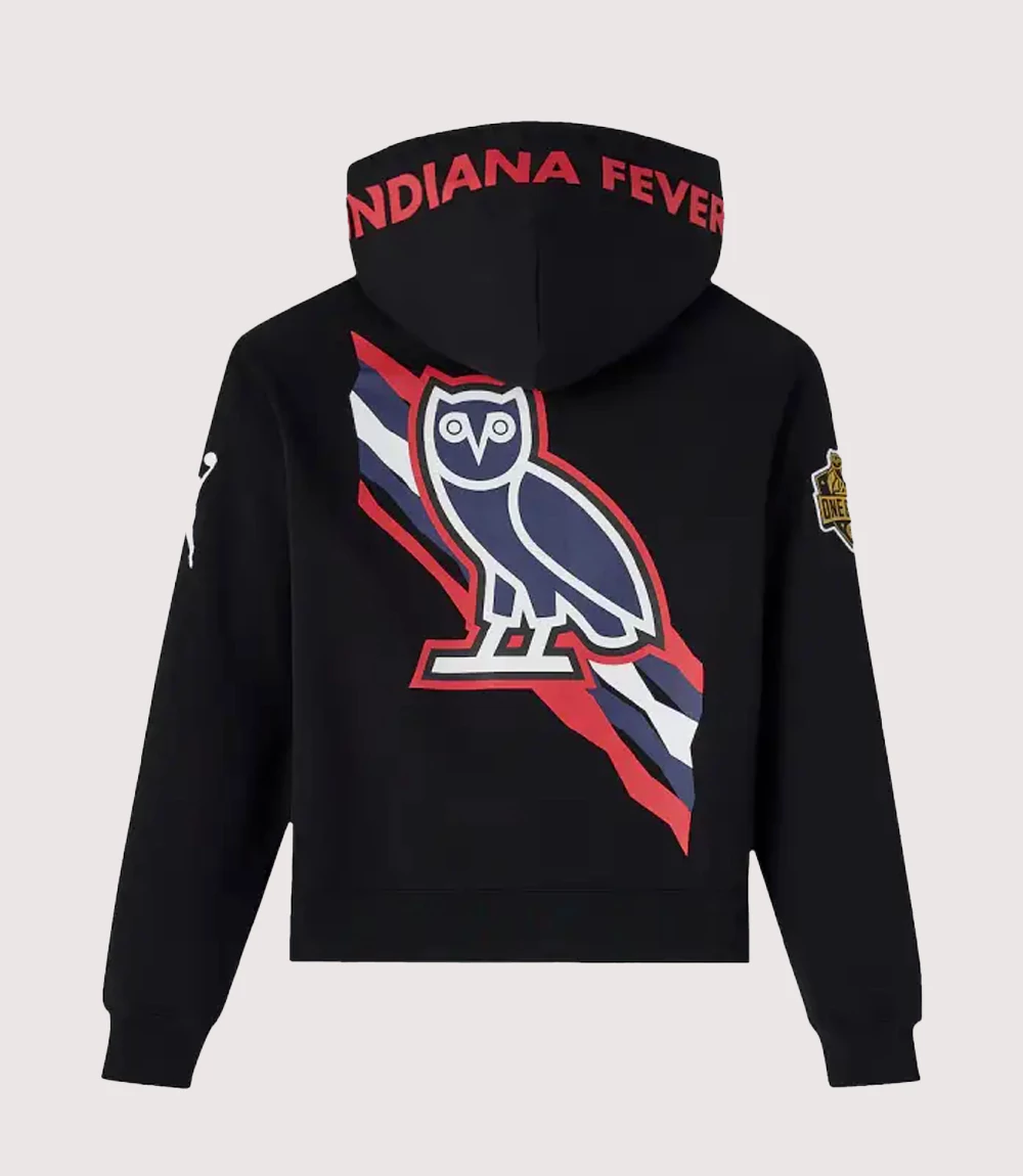 The visual identity of this October’s Very Own WNBA Hoodie is defined by its sophisticated, minimalist execution. The front features a large, iconic Indiana Fever wordmark across the chest, rendered in a high-density print that utilizes the team’s official red and blue colors. knitedge notes the crucial addition of the OVO gold owl logo prominently displayed on the sleeve or chest, signaling a rare and authentic partnership between the music mogul’s brand and the league. This Black OVO Owl Fever Sweatshirt perfectly balances athletic heritage with the “Varsity” aesthetic that OVO has perfected over the years.