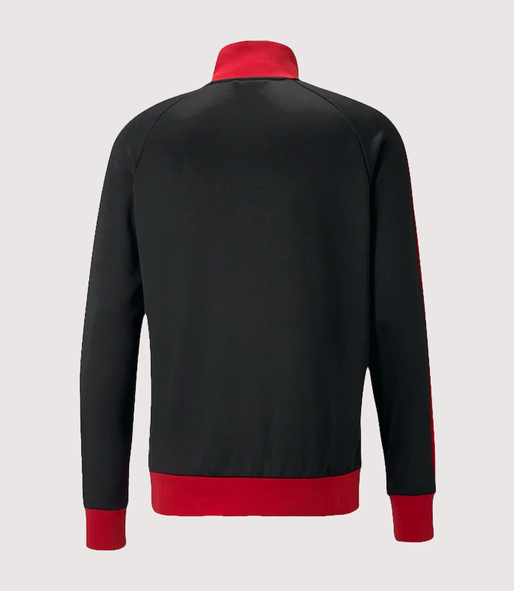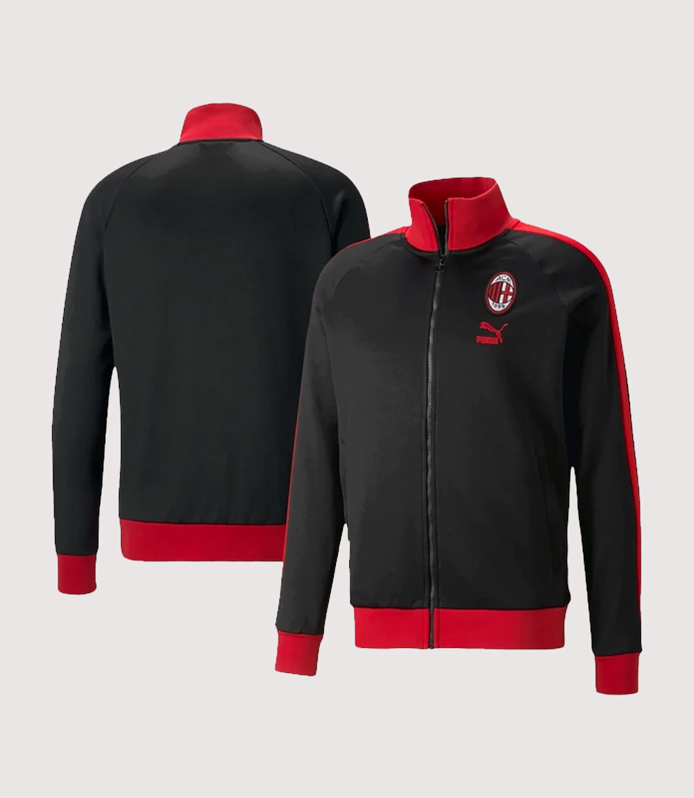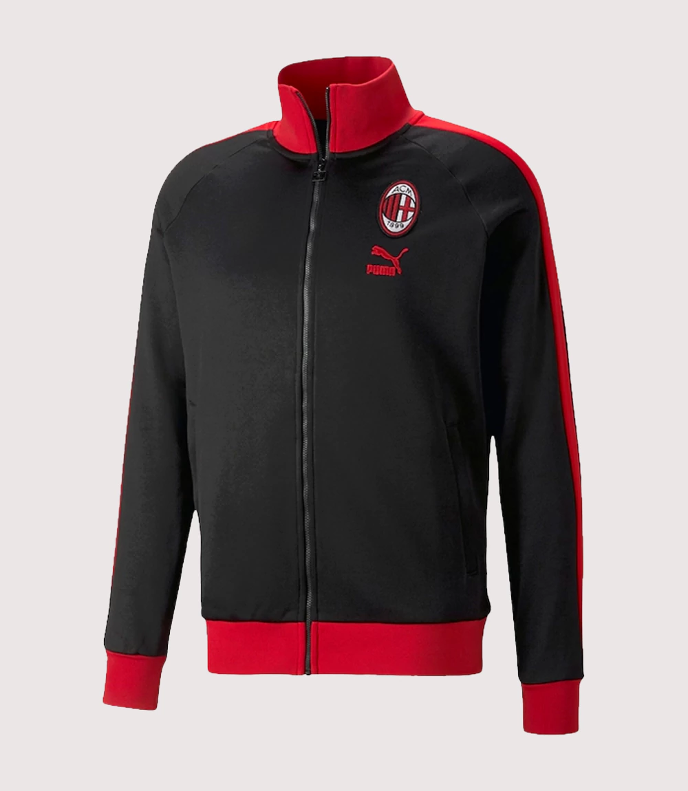The jacket is defined by the iconic Black and Red T7 Raglan Jacket design, featuring the signature 7cm contrast stripes running down the sleeves for a timeless, athletic look. The chest is anchored by a high-quality embroidered AC Milan crest on the left and the classic Puma archive logo on the right. knitedge ensures that every Men’s Black Rossoneri T7 Jacket is crafted from a premium blend of polyester and cotton featuring a soft French terry lining for additional warmth in mild temperatures.