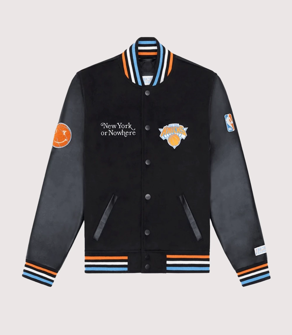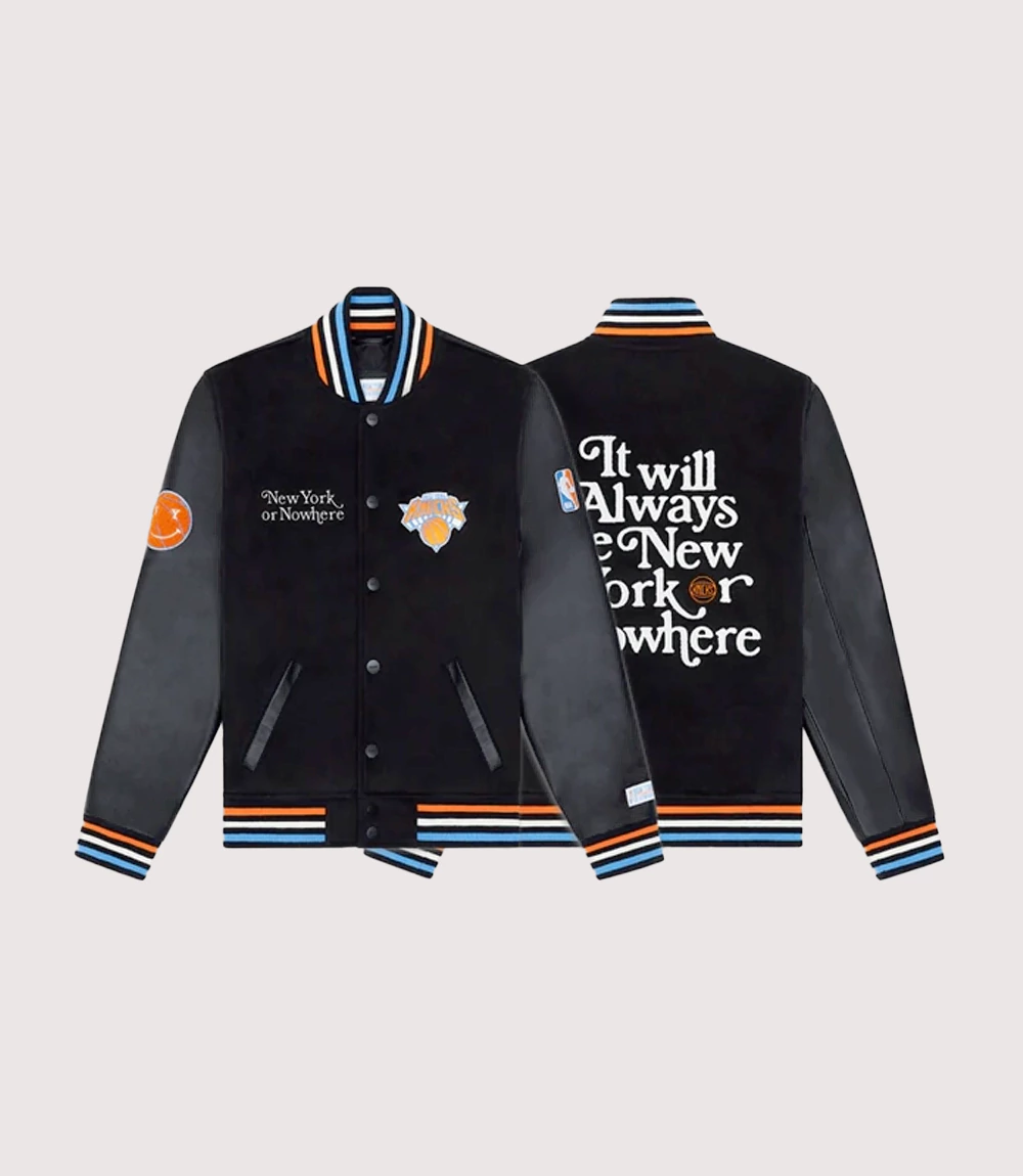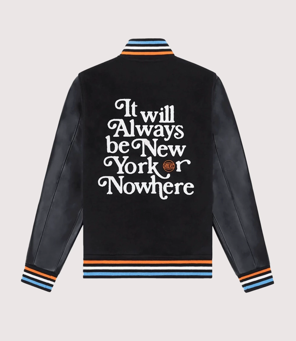 The jacket features a classic black wool-blend body paired with sleek Black Leather Sleeve Varsity Jacket styling for a truly premium feel. The chest is adorned with the official team logo and the “New York or Nowhere” slogan, while the back makes a bold statement with the “It Will Always Be New Yorker” typography. As a centerpiece of NBA Playoff Fashion Jacket trends knitedge ensures that every embroidery and patch is crafted with precision to match the original aesthetic. This Knicks Always a New Yorker Jacket is a testament to loyal fandom and urban luxury.