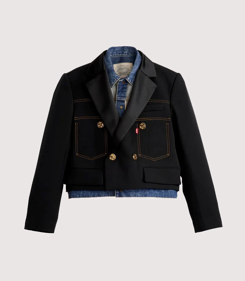 A : No, the layers are permanently integrated as part of Sacai’s signature hybrid construction. This ensures the Levi’s x Sacai Cropped Deconstructed Denim Jacket maintains its precise, complex silhouette throughout the day.