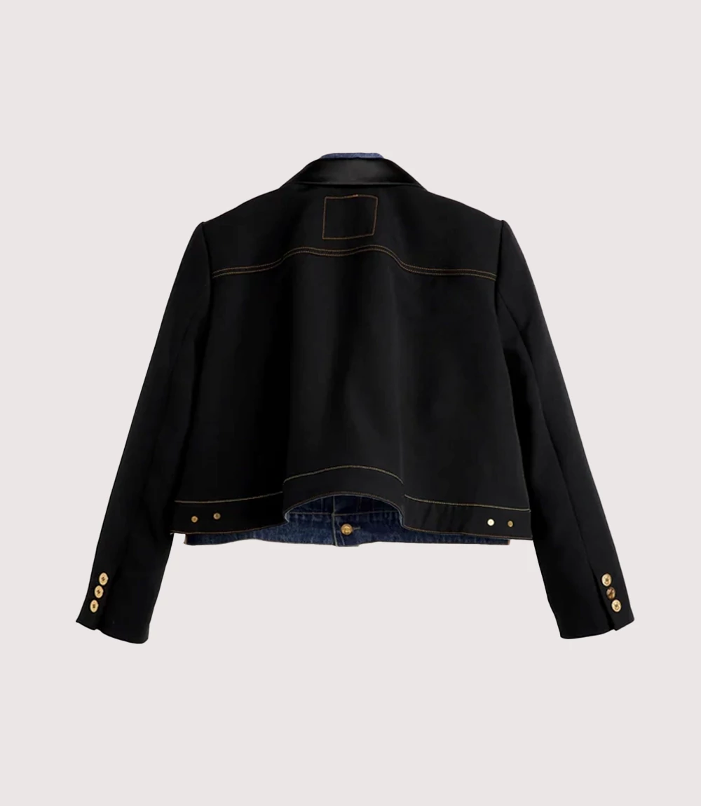 The Levi’s x Sacai Cropped Deconstructed Denim Jacket features a layered, mixed-media construction where a sleek, black matelassé twill blazer is “fused” over a medium-wash indigo denim jacket. The blazer portion boasts sharp peaked lapels and a double-breasted front adorned with ornate gold-tone buttons, while the denim elements peek out from the collar, placket, and raw-edged hem. knitedge ensures that every Luxury Japanese Hybrid Tailoring piece retains authentic heritage details, including the signature Levi’s Red Tab on the chest pocket and contrast copper stitching. With its cropped length and structured shoulders, this Black Double-Breasted Matelassé and Denim Blouson is a masterclass in Premium Designer Mixed-Media Cropped Jacket design.
