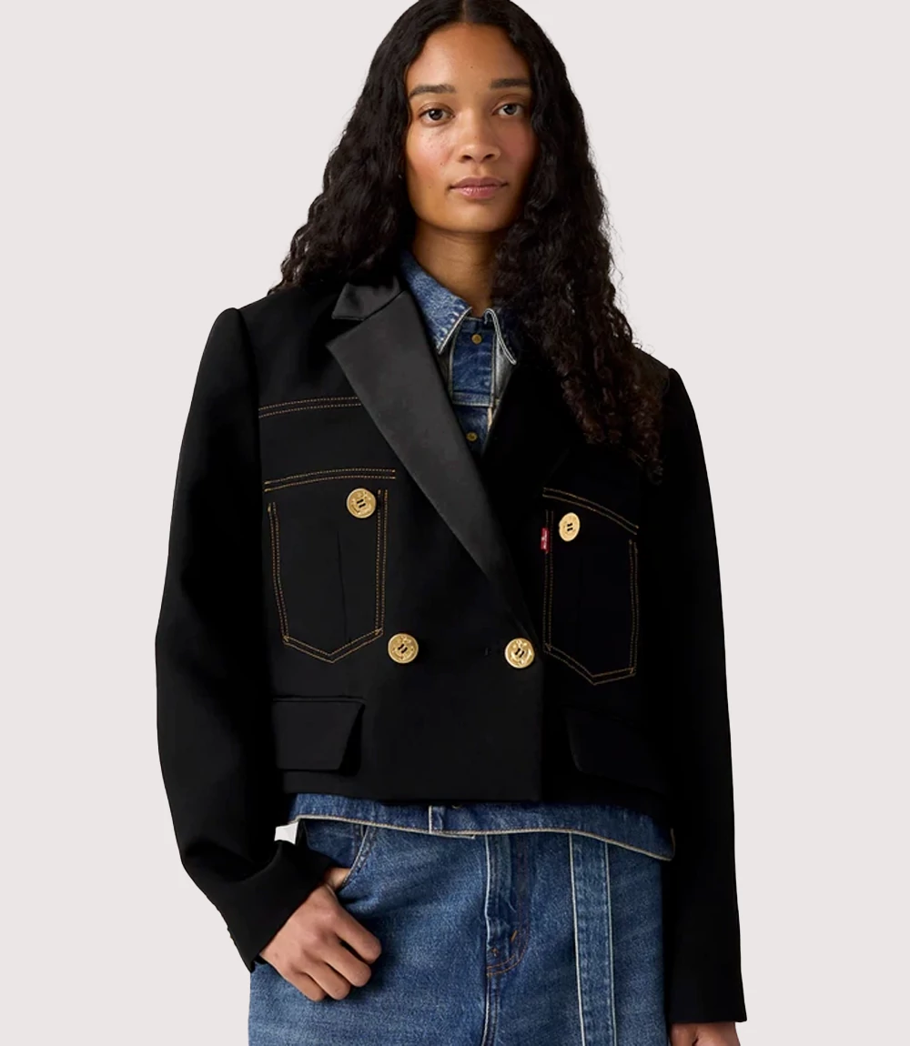 A : Matelassé is a weaving technique that yields a quilted or “padded” appearance, providing the blazer section of the Levi’s x Sacai Women’s Denim x Matelassé Twill Jacket with a rich, dimensional texture. It adds a luxurious weight that contrasts beautifully with the flat texture of the Essential Avant-Garde Tailored Streetwear denim.