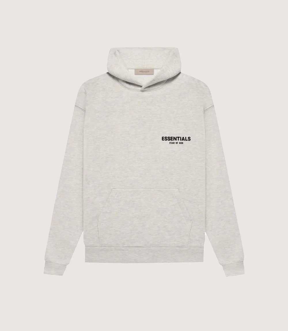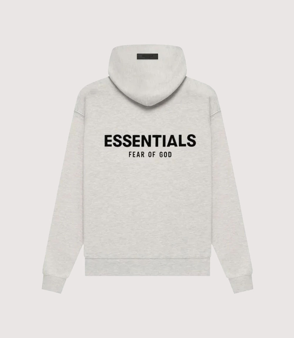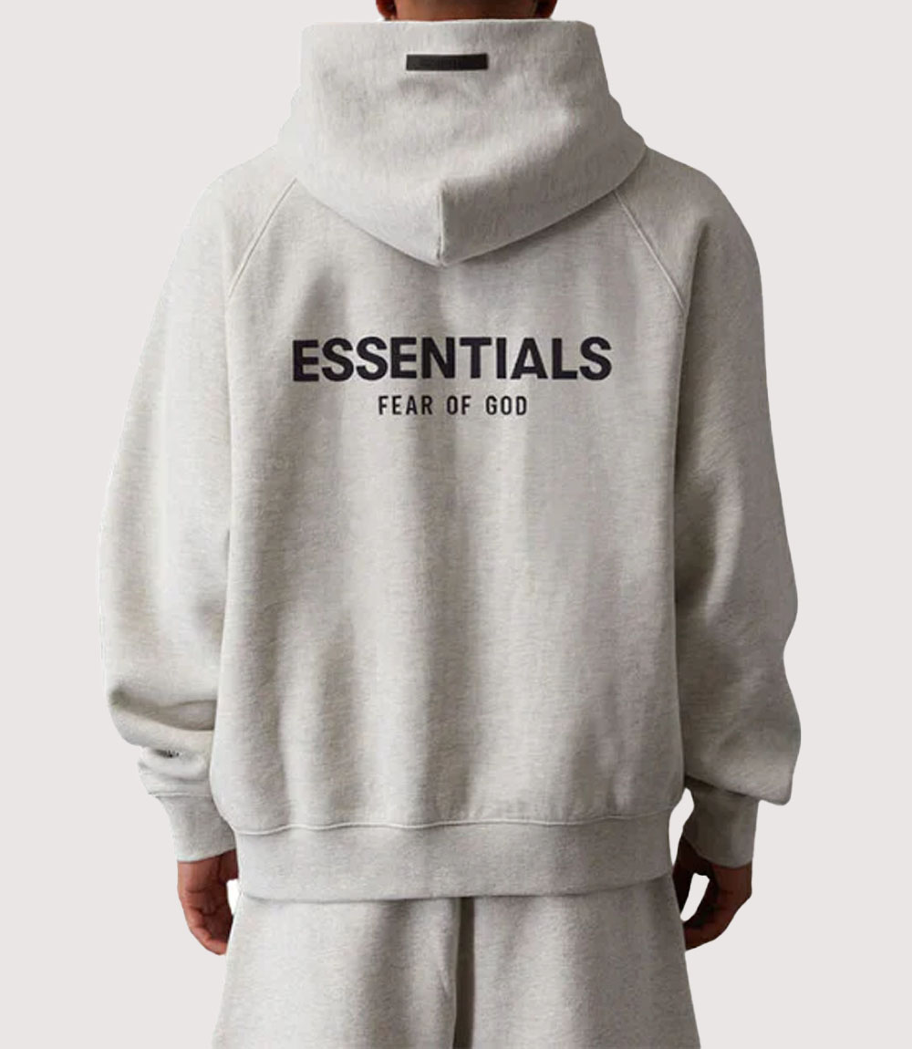 The visual identity of this Fear of God Essentials Grey Hoodie is defined by its subtle, understated branding. The center chest features the “ESSENTIALS” logo in a tonal, soft-touch rubberized applique, providing a clean and tactile finish. knitedge notes the secondary branding on the hood a small, rectangular rubberized label which has become a hallmark of the collection, ensuring the piece is recognizable to enthusiasts from any angle.