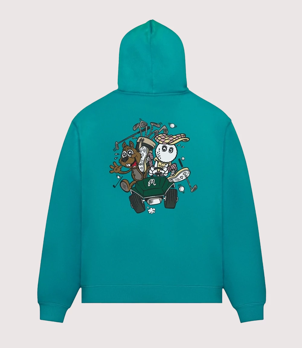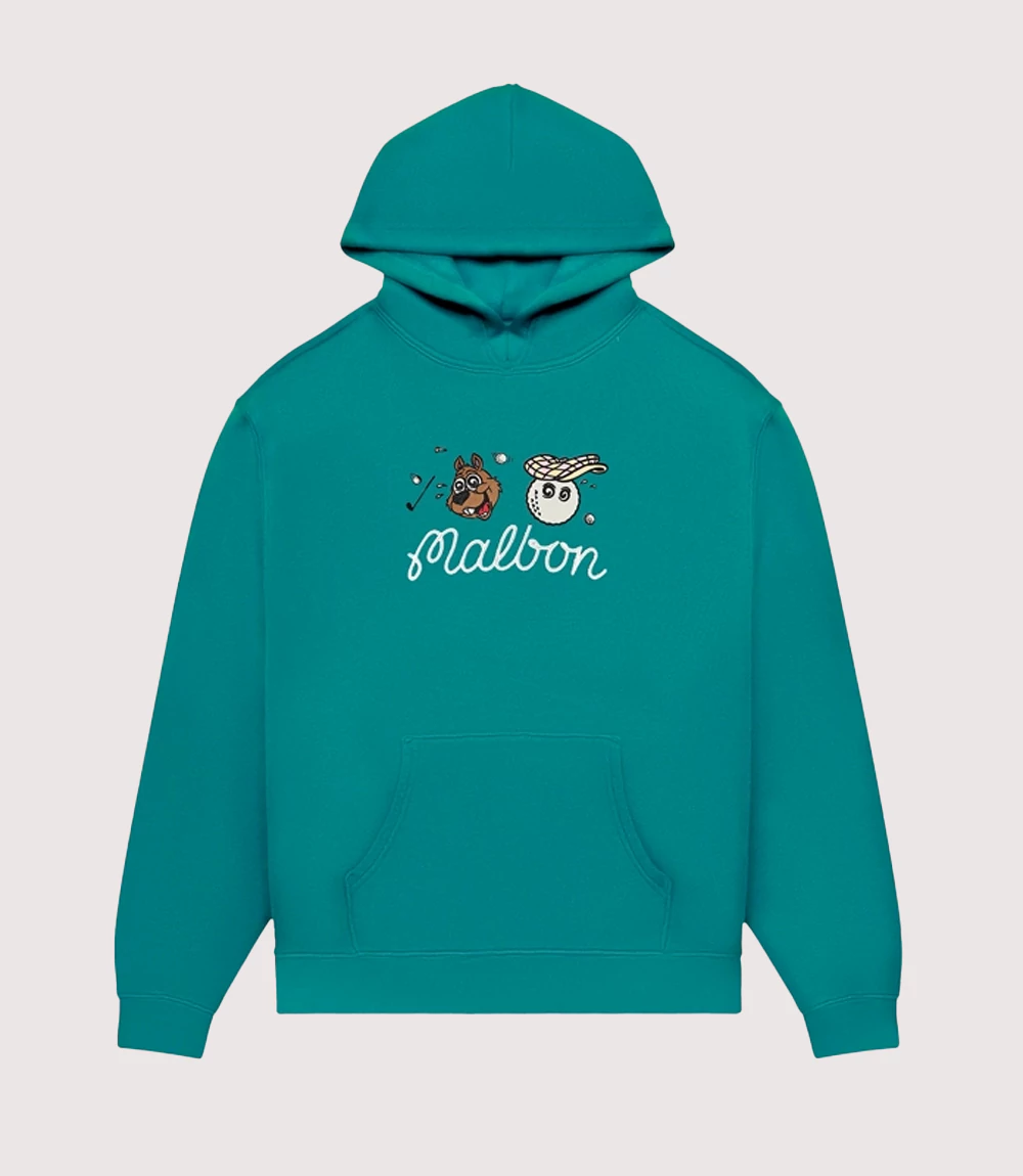 A : The “Two Man Scramble” refers to a popular golf tournament format where two players work as a team. The Malbon Two Man Scramble Hoodie pays homage to this social side of the game with its playful character graphics.