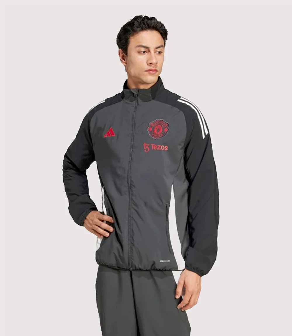 The Official Man Utd Tezos Training Gear features a sophisticated two-tone grey and black colorway, accented by vibrant red details. It prominently displays the heat-applied Manchester United crest and the Adidas performance logo on the chest, alongside the official “Tezos” training sponsor. knitedge ensures that every Adidas AEROREADY Manchester United Jacket is built for modern athletes, featuring moisture-wicking technology to keep you dry and comfortable during exertion. With its slim, streamlined fit, high stand-up collar, and signature white 3-stripes on the shoulders, this Grey and Black Man Utd Training Outerwear is a masterpiece of Essential Manchester United Football Training Apparel.