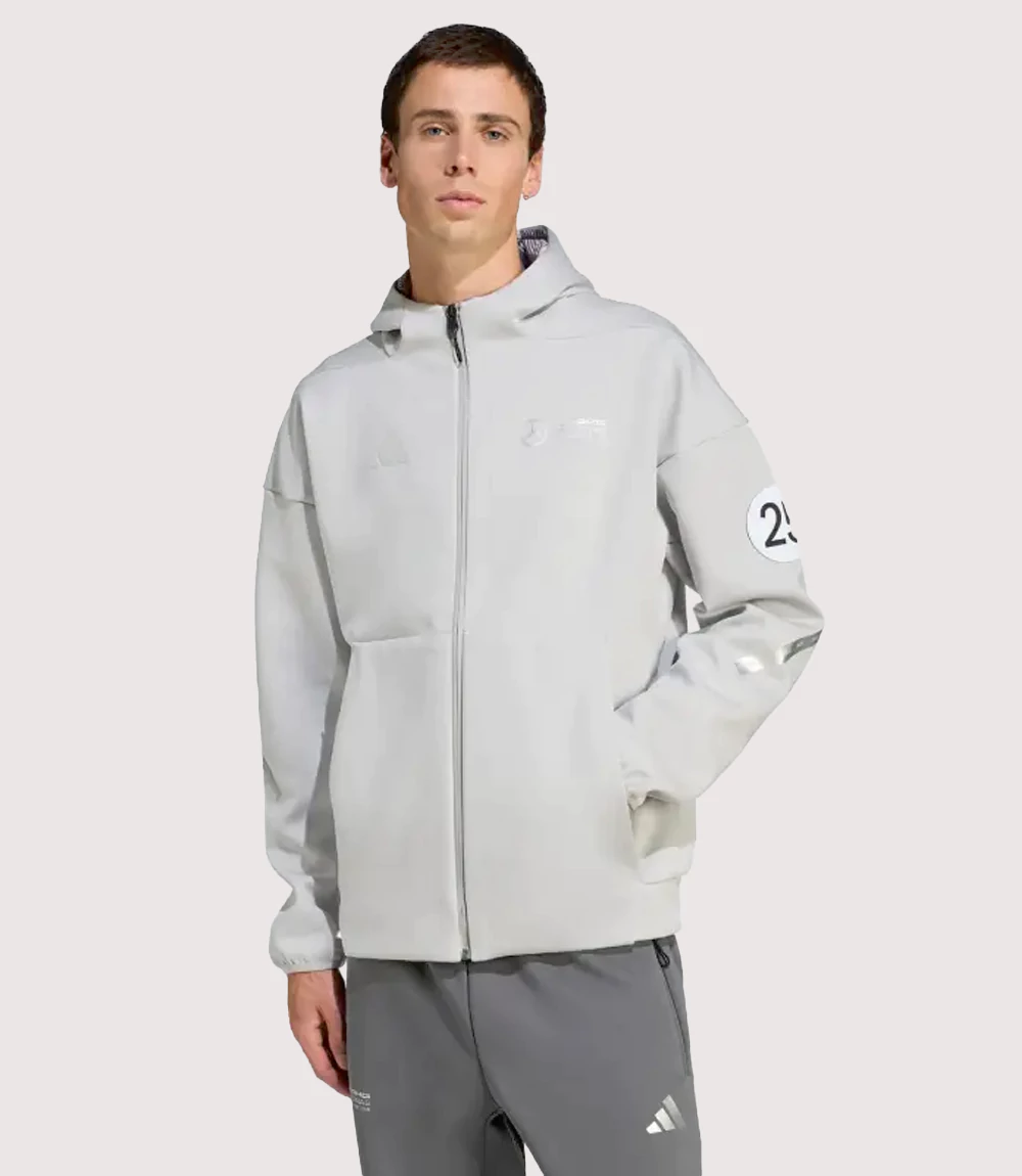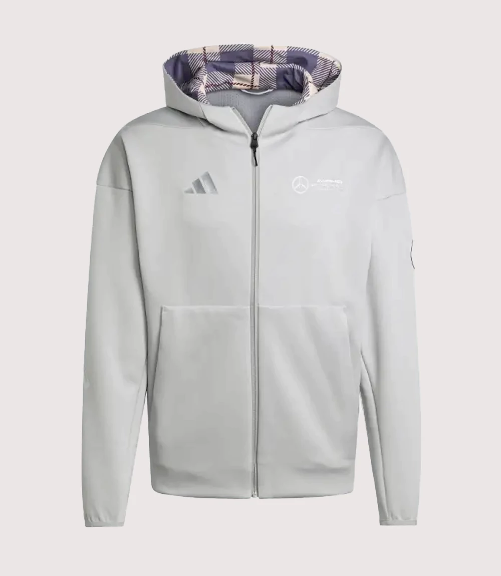The hoodie is rendered in a light metallic silver or “grey-white” technical fabric, featuring a smooth, moisture-wicking exterior ideal for performance environments. The design is marked by dual branding on the chest: the iconic Adidas three-bar logo on the right and the Mercedes-AMG Petronas F1 Team crest on the left. A defining and unique characteristic of this Silver Arrows Performance Zip-Up is the interior hood lining, which features a classic purple and white plaid pattern, providing a subtle pop of heritage color. At knitedge we appreciate the streamlined construction, including the full-length central zipper, a high-neck collar for wind protection, and expansive side-entry pockets integrated into the lower torso for a sleek silhouette.