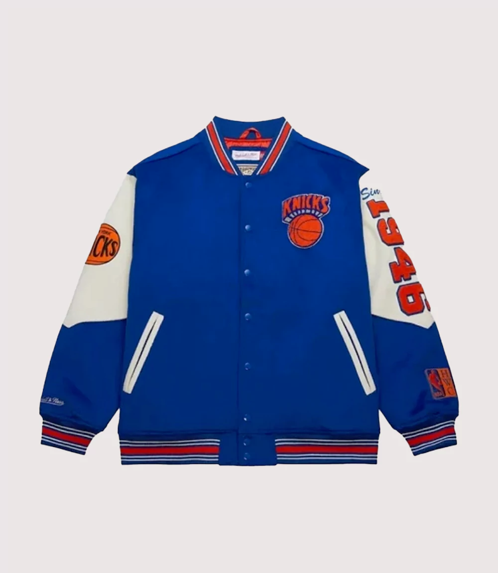 The Mitchell & Ness NBA Team History Outerwear is defined by its classic tri-color scheme, featuring a bold royal blue wool-blend body contrasted by cream-colored sleeves. A standout design element is the high-definition embroidery, including the traditional Knicks basketball logo on the chest and the “Since 1946” commemorative graphic on the left sleeve, marking the team’s founding year. knitedge ensures that every Official Knicks Anniversary Varsity Jacket is built with premium attention to detail, featuring a full snap-button front, striped rib-knit trim in team orange and white, and clean welt pockets for a refined finish. Whether you’re at the Garden or on the city streets, this Blue and White Knicks Letterman Jacket offers a sophisticated way to show your lifelong fandom.