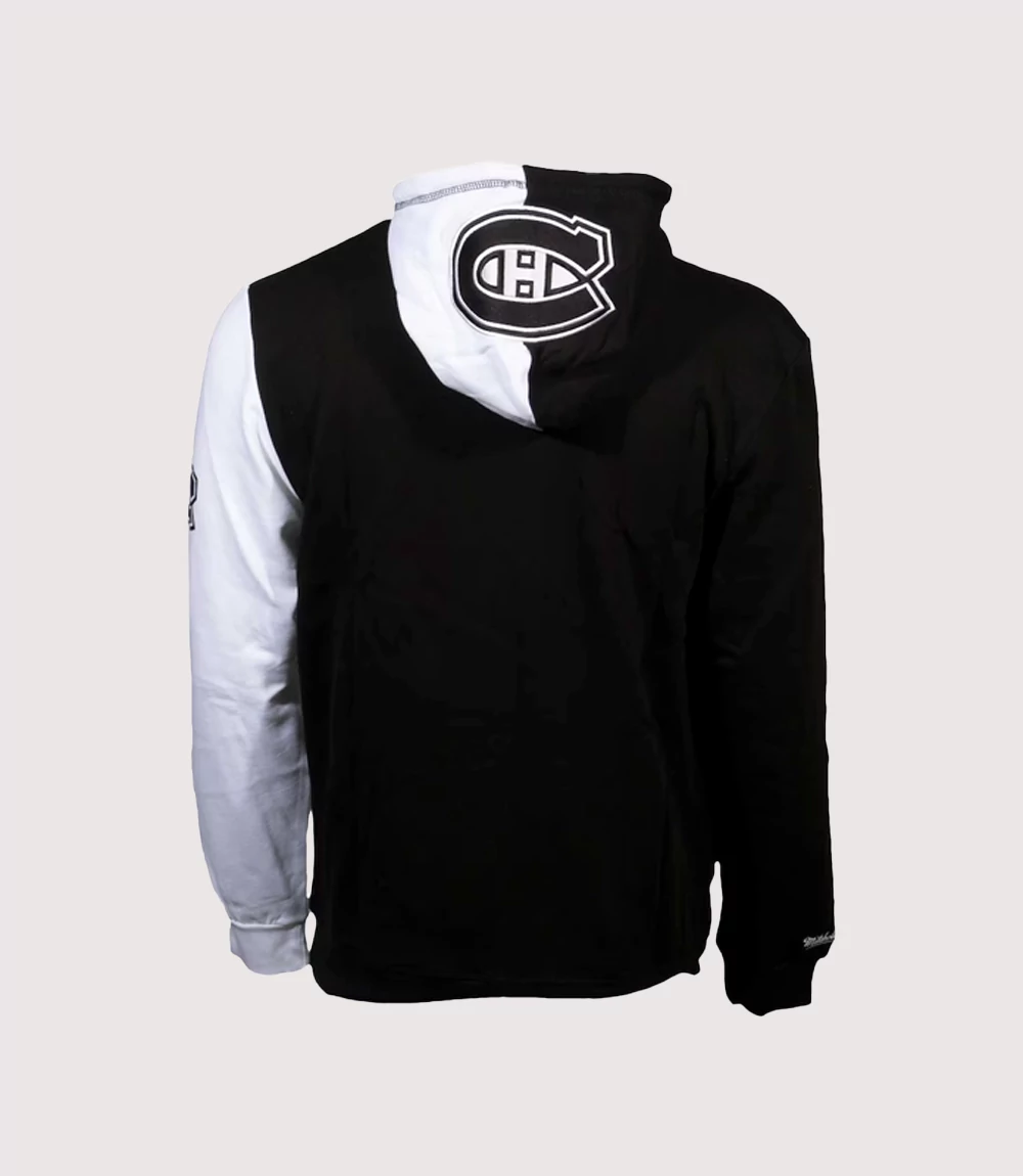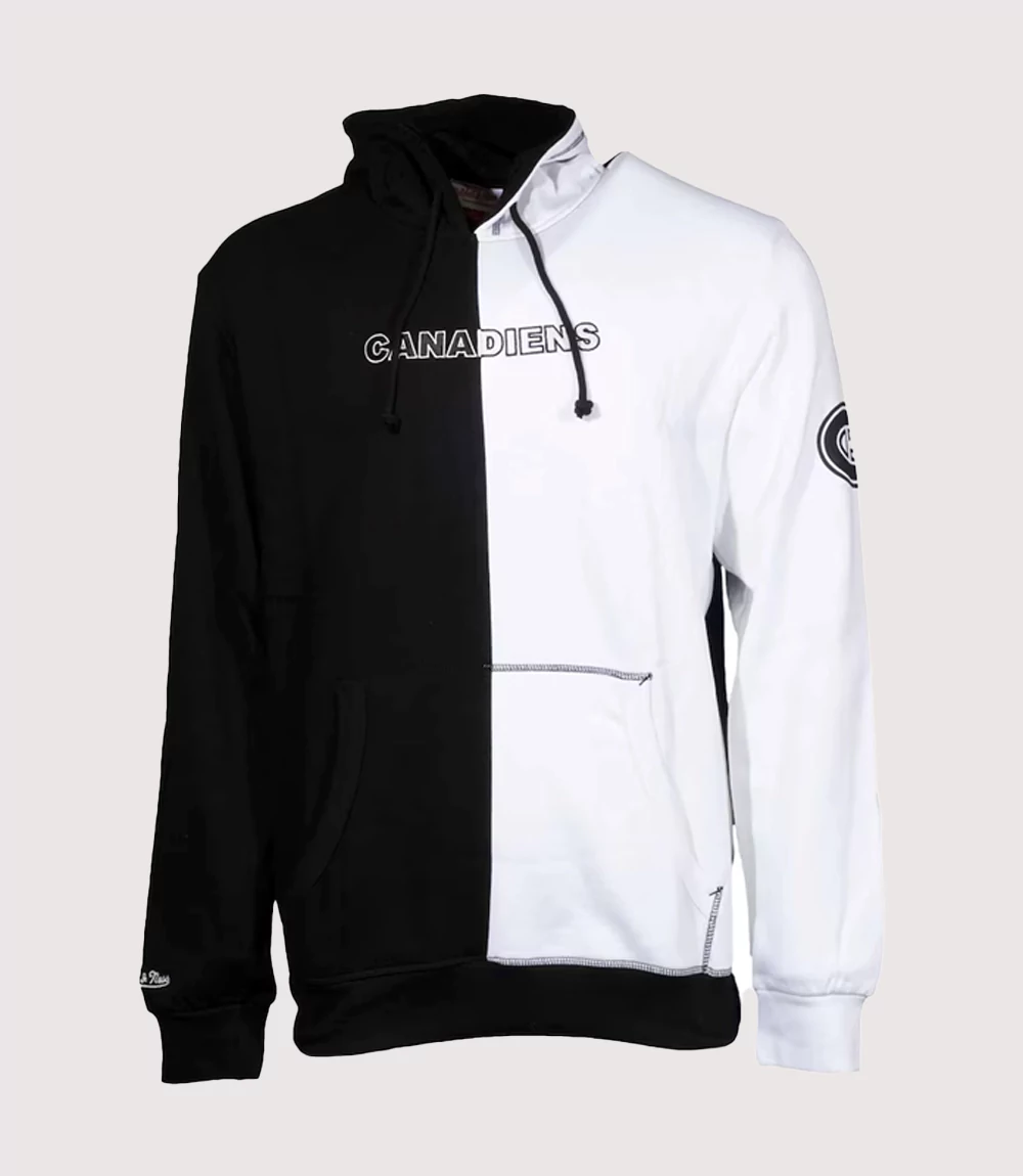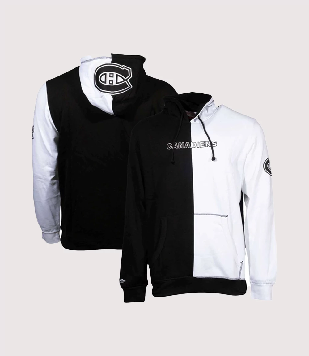 Make a bold statement with the Mitchell & Ness Montreal Canadiens Night & Day Hoodie, a dynamic piece of fan apparel that breaks away from traditional team colors. This hoodie offers a modern, high-contrast aesthetic that celebrates the winningest franchise in NHL history. At knitedge we provide this Men’s Black and White Canadiens Split Hoodie designed for fans who want a monochromatic, streetwear-inspired look without sacrificing team pride.