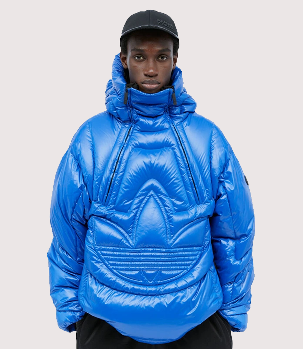 A : The Moncler x Adidas Originals Chambery Down Jacket features specialized “Trefoil quilting,” where the padding itself forms the shape of the classic Adidas logo on the front of the jacket. This creates a three-dimensional, sculptural effect that is a hallmark of the Adidas Originals x Moncler Chambery Blue collection.