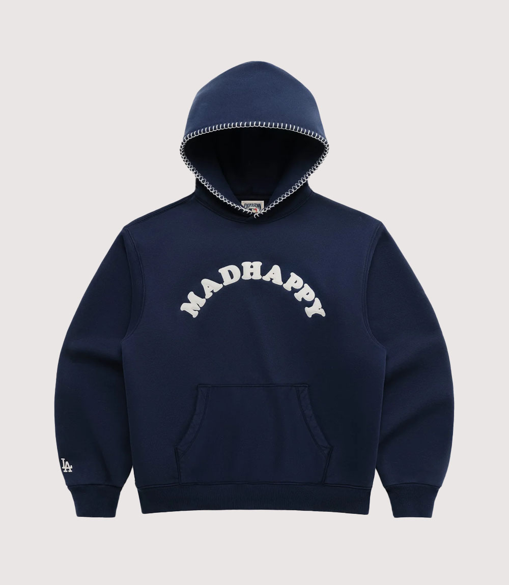 The visual identity of this Madhappy Dodgers Navy Arch Logo Hoodie is defined by its clean, classic branding. The front features a large, off-white “MADHAPPY” arch across the chest in a vintage-inspired serif font. knitedge notes the strategic placement of the legendary “LA” logo embroidered in white on the lower right sleeve, providing a subtle yet powerful nod to the team’s home city without overwhelming the garment’s minimalist aesthetic.