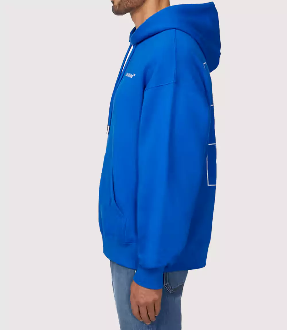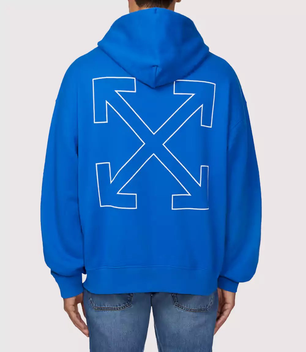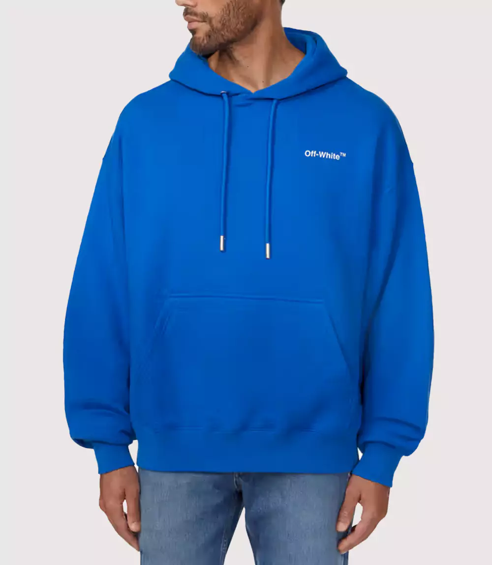 Trendy blue hoodie soft inside and eye-catching Off-White branding.