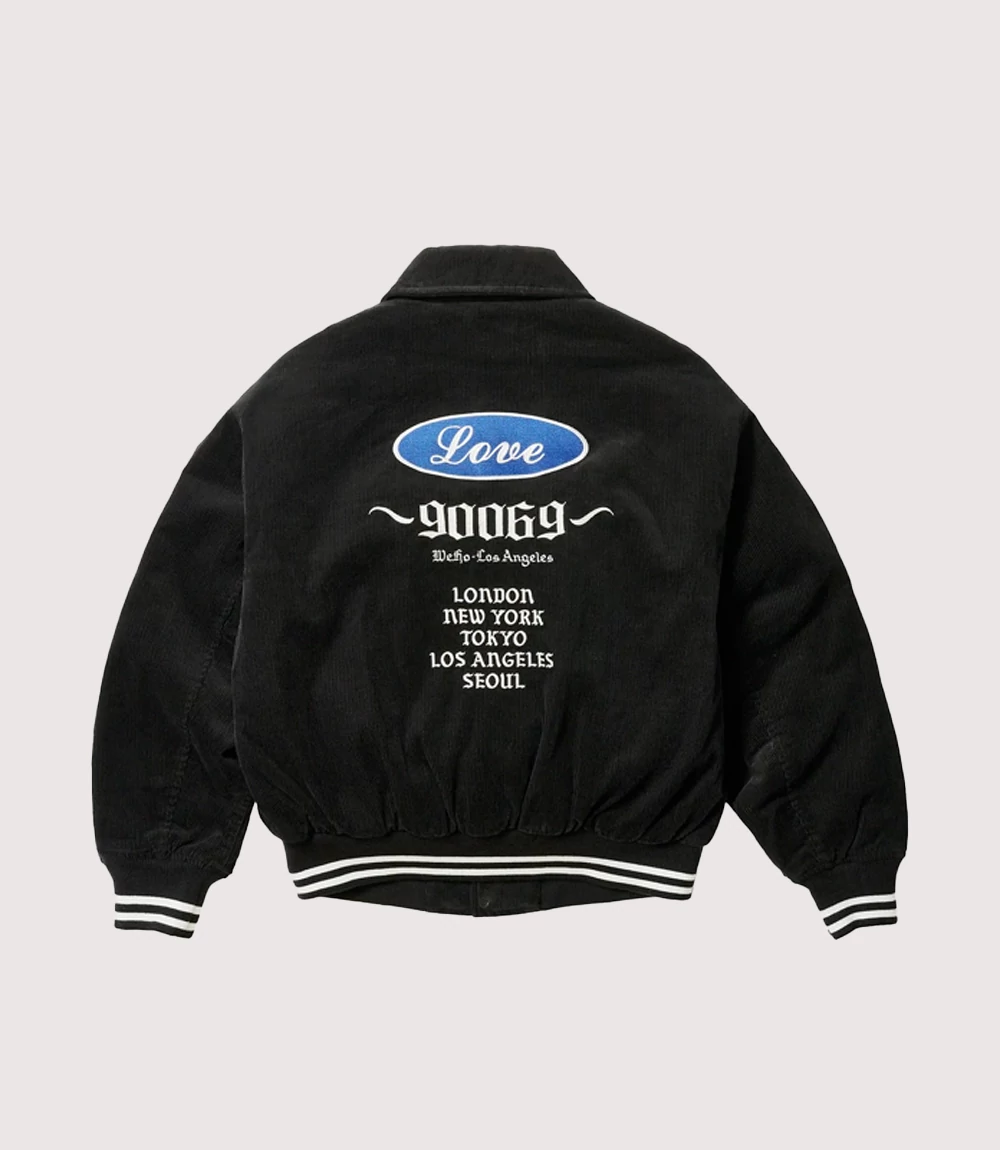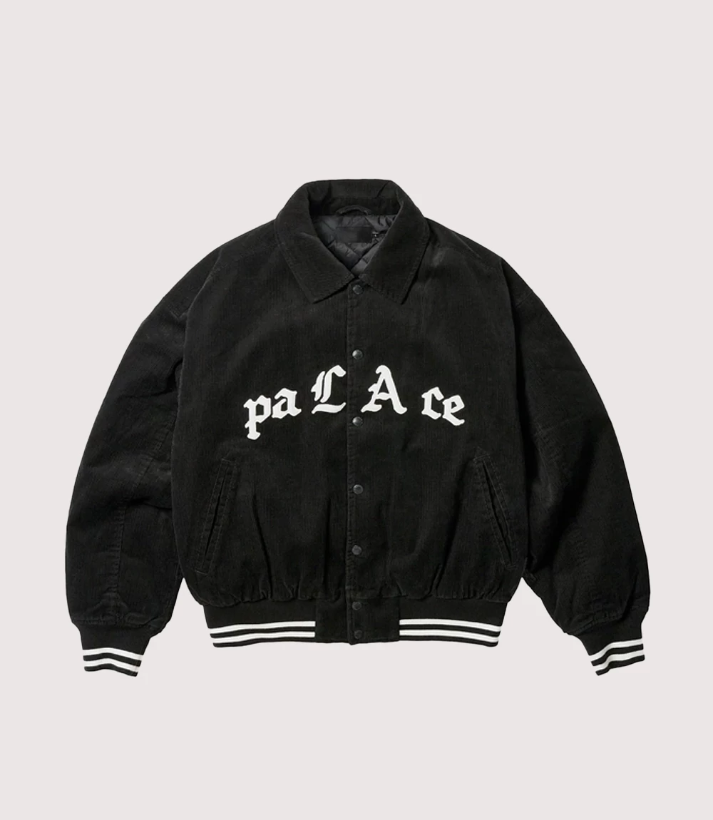 A : No, the logo on the Palace Love Black Varsity Jacket is a high-quality fabric appliqué. Each gothic letter is individually stitched onto the corduroy shell, providing a premium, raised texture that is far more durable than standard screen printing.