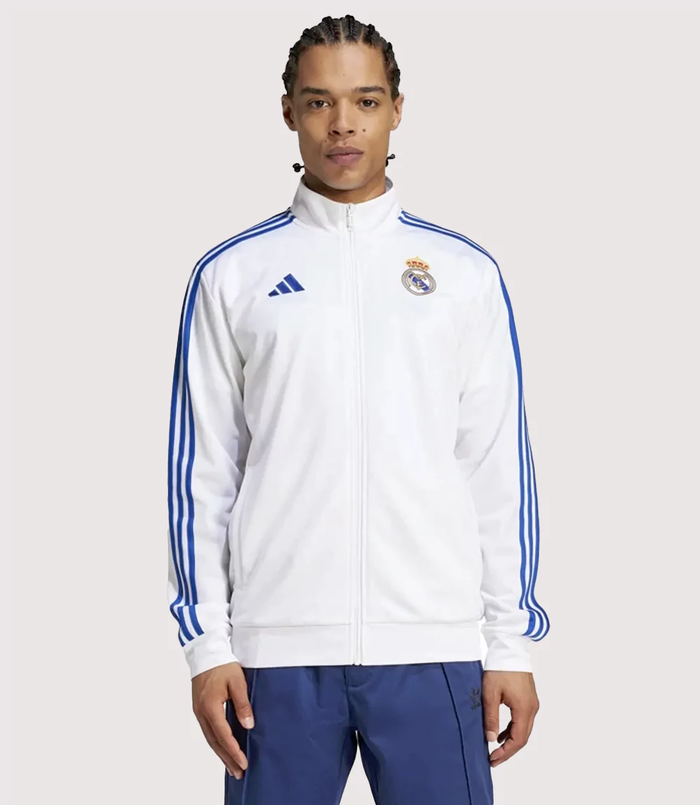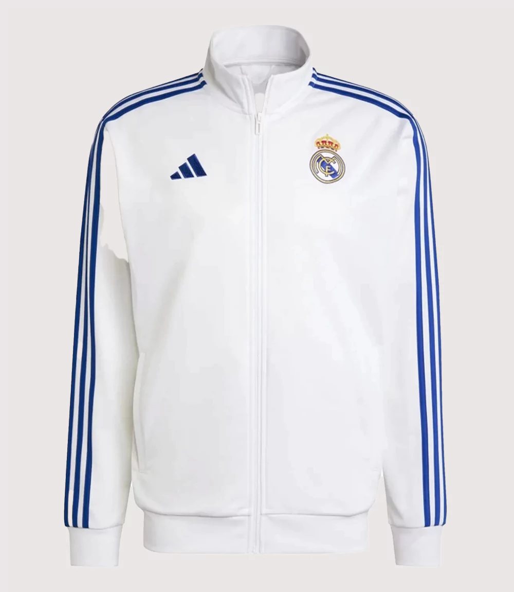 A : This specific Real Madrid Adidas DNA Track Jacket 24/25 is crafted in the club’s iconic home white. However knitedge frequently updates its collection with various Men’s White Real Madrid Lifestyle Jacket styles including away and third-kit colorways as they become available.