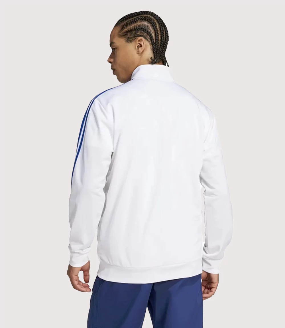 This Adidas Real Madrid 3-Stripe Track Top features the iconic clean white base that has defined Los Blancos for over a century accented by striking royal blue stripes down the sleeves. Crafted from premium durable double-knit fabric, it provides a smooth exterior and a comfortable interior fit. knitedge ensures that every Official Los Blancos Heritage Jacket includes the high-quality embroidered club crest and the signature Adidas performance logo on the chest. With its full-zip front and stand-up collar this White and Blue Adidas Soccer Jacket is the ultimate versatile layer for match days or casual city outings. Experience the perfect blend of tradition and performance with a jacket built for champions.