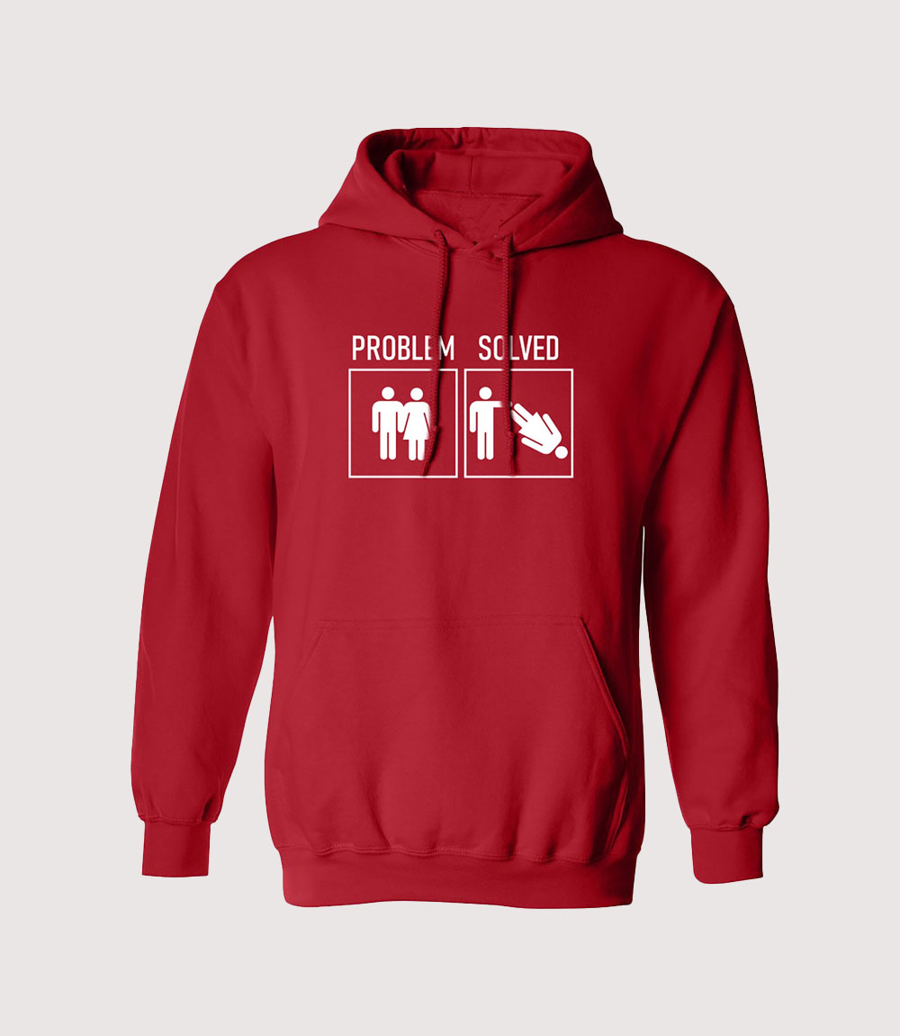 The focal point of this Funny Stick Figure Graphic Red Hoodie is the stark white storyboard printed across the center chest. The graphic features two sequential panels: the left panel depicts a pair of stick figures holding hands, while the right panel shows one figure being pushed away, underscored by the definitive text “PROBLEM SOLVED”. knitedge highlights how the high-contrast white ink pops against the deep red fabric, ensuring the satirical message is clear and legible from a distance.