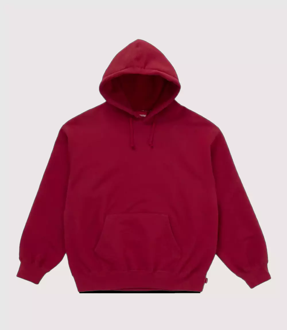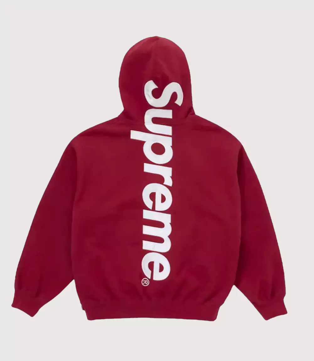 A : The Red Supreme Satin Applique Hoodie uses separate pieces of satin fabric that are stitched onto the fleece. This creates a raised, 3D texture and a subtle sheen that is far more resistant to wear and cracking than traditional screen printing.
