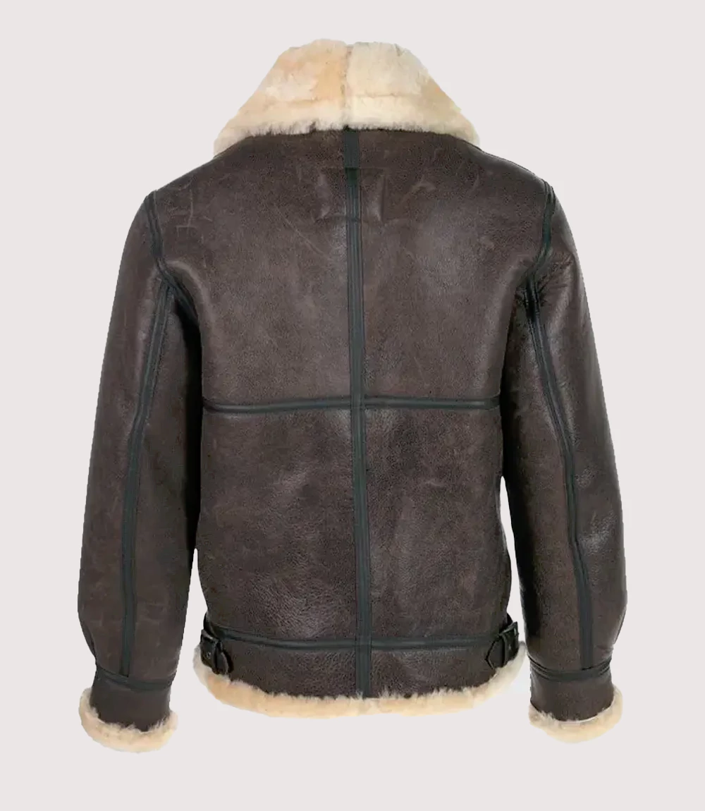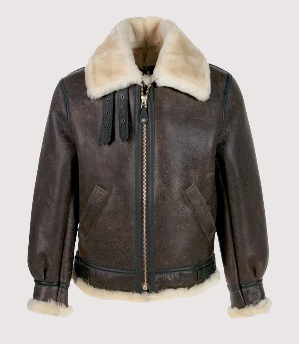 Collar : Wide shearling-covered aviator collar with dual adjustable buckle straps.