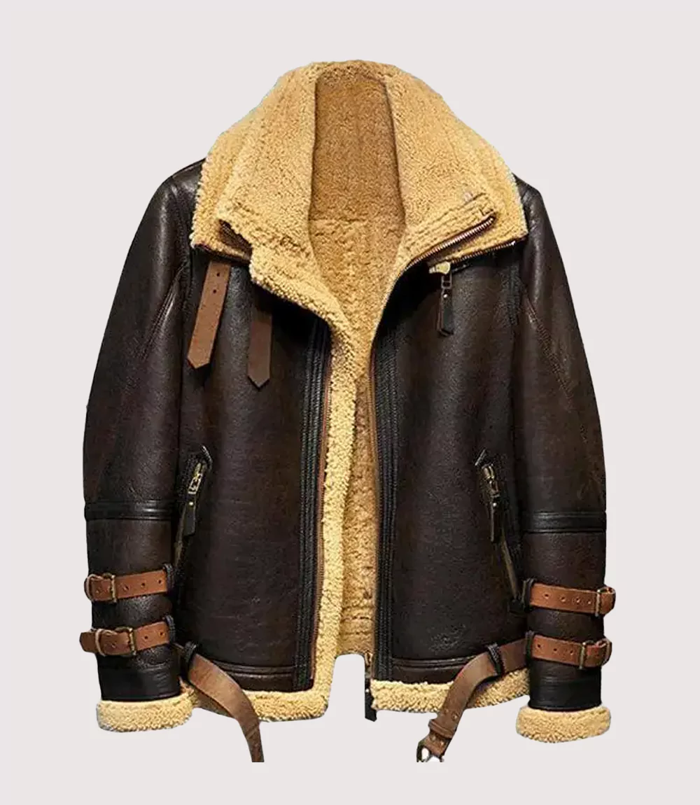 A : This Vintage Brown Leather Shearling Bomber features a structured, slightly oversized fit to accommodate the thick internal fur. Because it is a Premium Heavyweight Shearling Flight Jacket, it is designed to look bold and commanding. To maintain the sharp look of the Ronald Double Belted Cuffs Collar Brown Shearling Jacket, we recommend ordering your true size which allows for light layering underneath without feeling restricted.