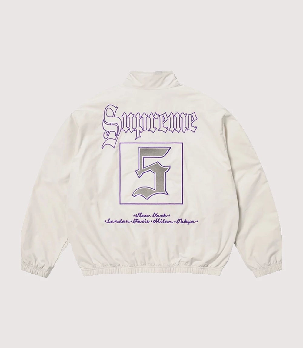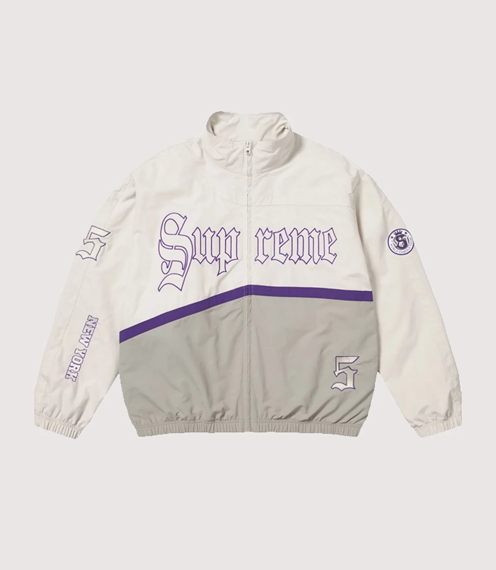 The White and Purple Supreme Track Jacket is defined by its elegant colorway, featuring a dominant cream-white upper body contrasted by a grey lower section and a sharp purple diagonal dividing line. The central feature is the “Supreme” wordmark embroidered across the chest in a large, purple Old English gothic script. knitedge ensures that every Gothic Script Supreme Athletic Outerwear piece includes premium details, such as the “World Famous” seal on the left sleeve and “New York” typography on the right. With its lightweight, water-resistant nylon construction and breathable mesh lining, this Premium Nylon Supreme Colorblock Jacket is the Essential Supreme Streetwear White Windbreaker for any season.