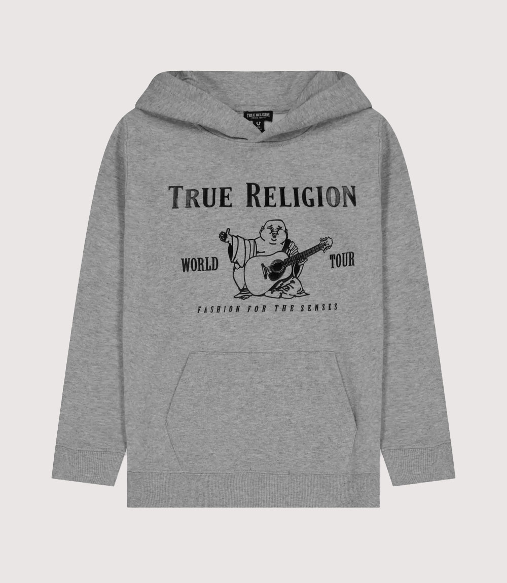 The center of this World Tour Buddha Pullover features the legendary True Religion “Buddha” graphic in high-contrast black ink. The illustration depicts the laughing Buddha playing an acoustic guitar, flanked by “WORLD TOUR” text and the brand’s signature “Fashion for the Senses” tagline. knitedge notes that the placement of the “TRUE RELIGION” arched branding above the graphic creates a balanced, collegiate-inspired layout that has remained a fan favorite for decades.