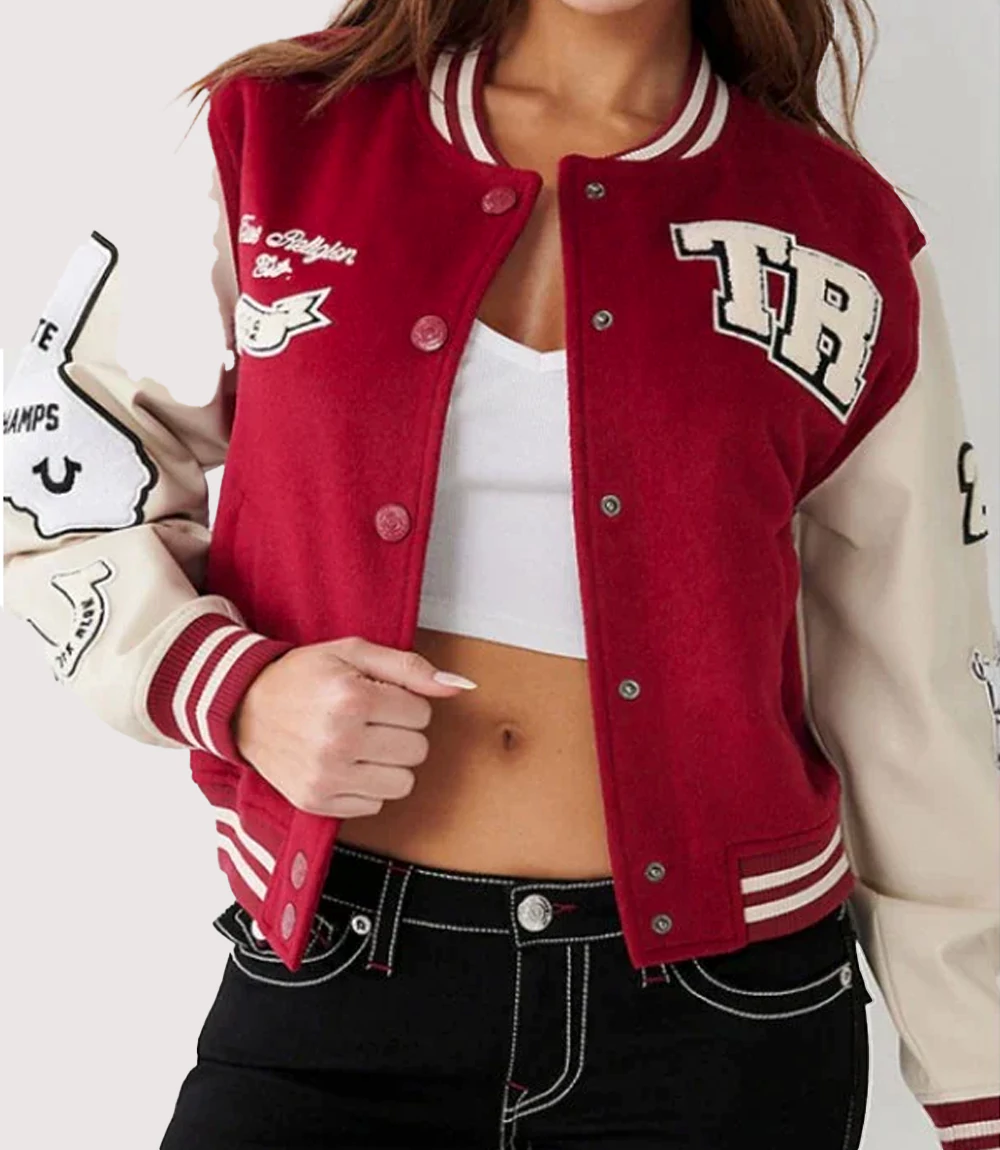 Elevate your streetwear game with the True Religion Varsity Jacket For Women a bold statement piece that blends traditional American collegiate style with the brand’s unmistakable denim roots. This jacket reimagines the classic letterman silhouette for the modern woman, offering a high-contrast design that is both nostalgic and contemporary. At knitedge we value garments that tell a story of brand heritage, and this Women’s Collegiate Letterman Jacket serves as a perfect canvas for True Religion’s iconic iconography.