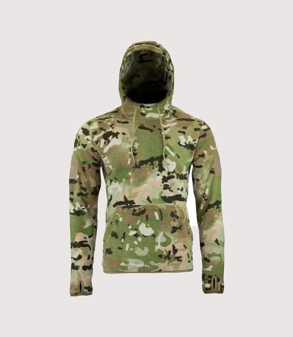 The functional design of this V-Cam Tactical Fleece is centered on utility and low-profile performance. Unlike standard sweatshirts, this hoodie features a high-neck integrated hood with adjustable drawstrings, providing superior protection against wind and debris. knitedge notes the tactical-specific additions, such as the hook-and-loop (Velcro) patches on the upper sleeves, which allow for the easy attachment of ID markers or morale patches, and the thumb-loop cuffs that keep sleeves securely in place during intense movement.