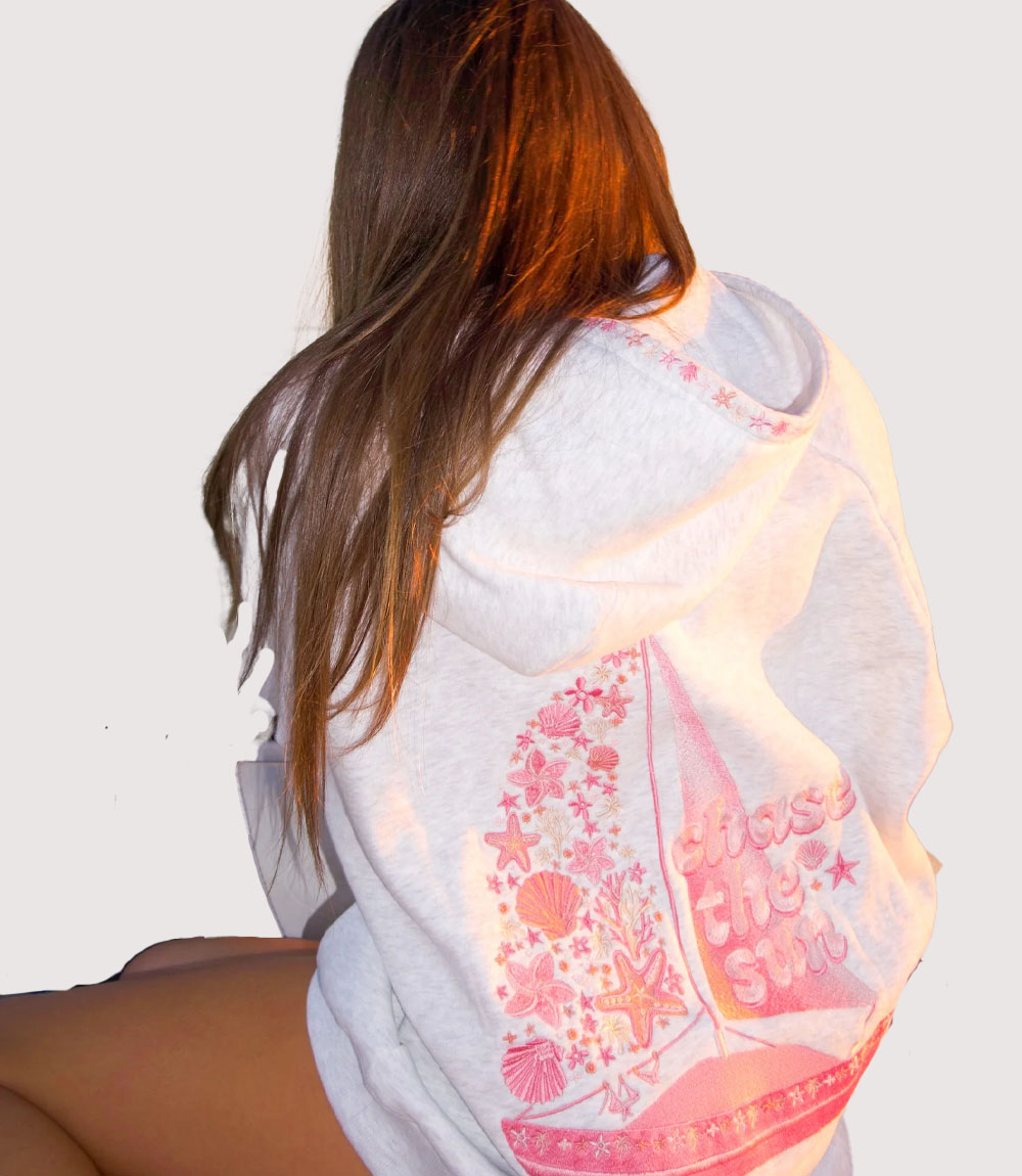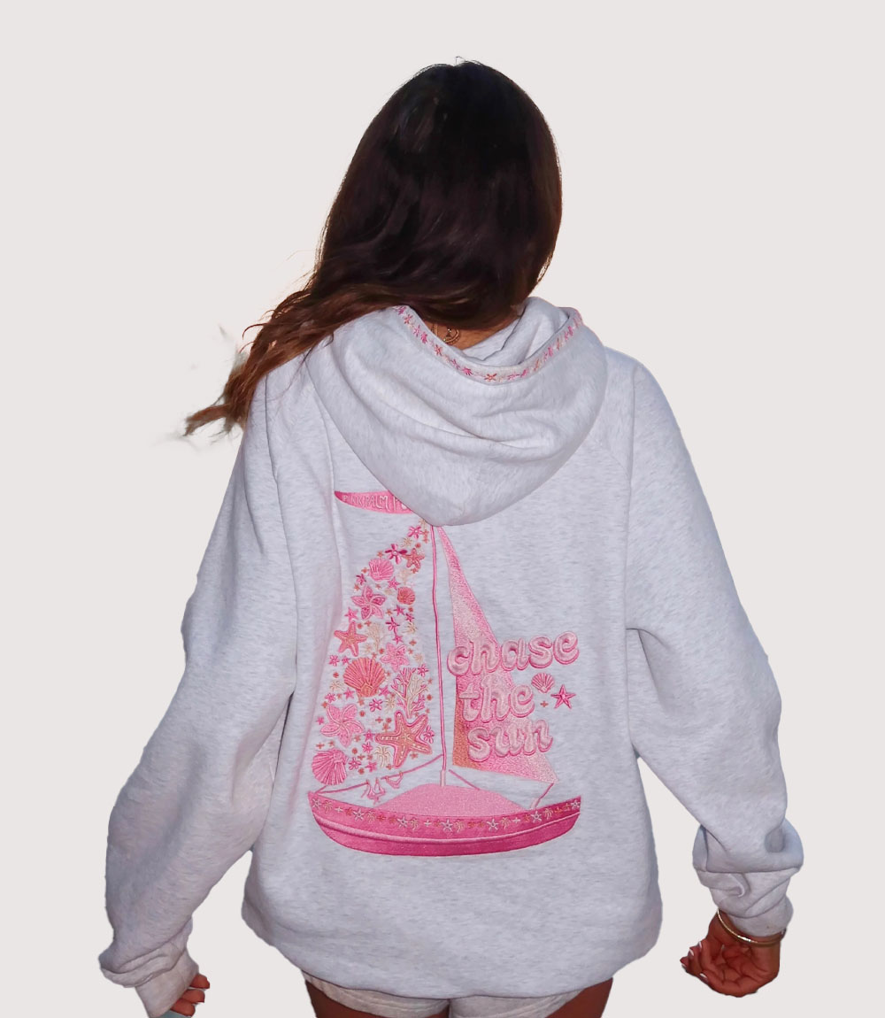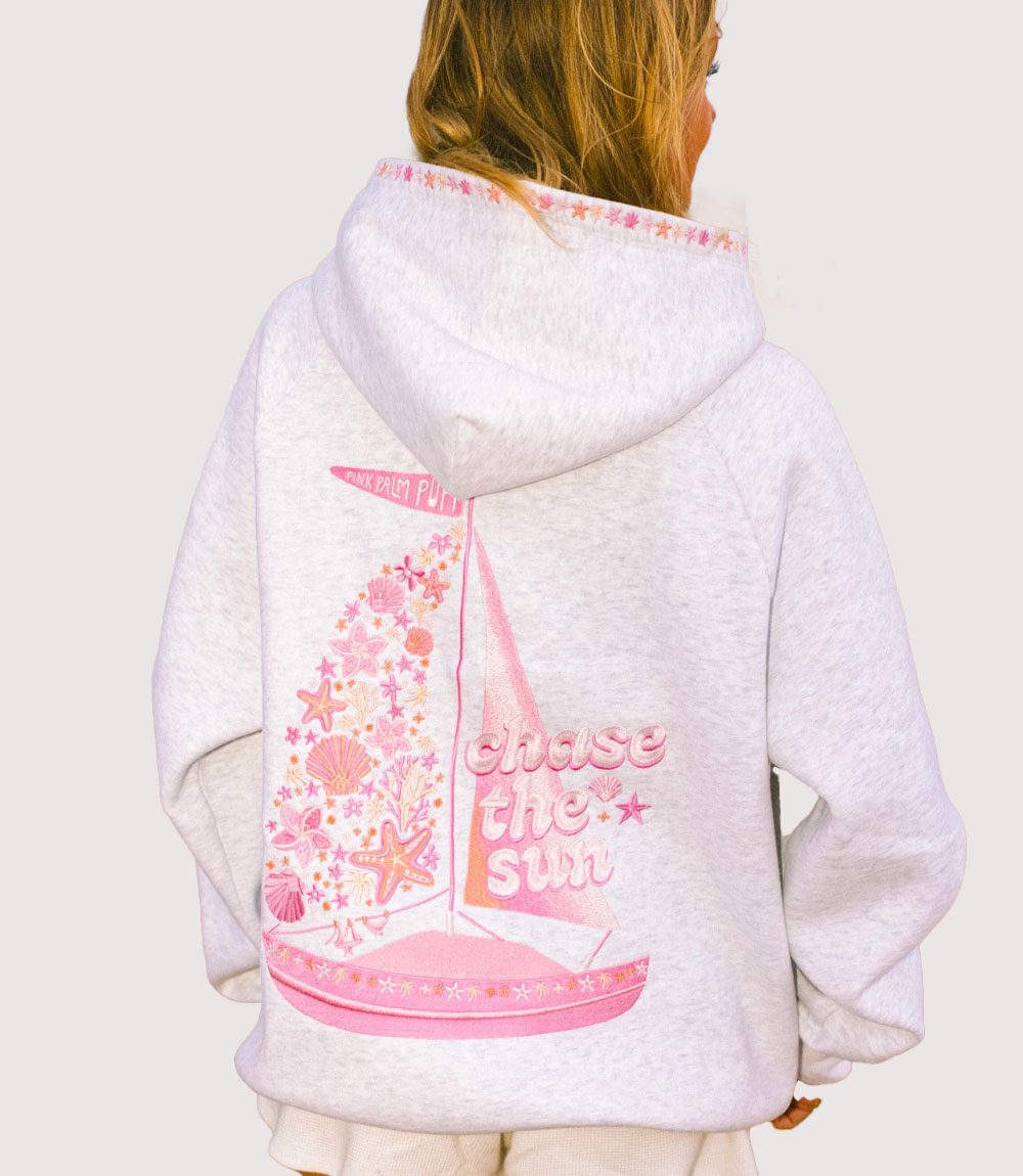 The visual identity of this Women’s Sailboat Graphic Pink Hoodie is defined by the elaborate sailboat motif on the reverse. The sail is composed of a dense collage of pink hibiscus flowers, starfish, and shells, all rendered in varying shades of rose and fuchsia. knitedge notes the playful “Chase the Sun” typography positioned alongside the boat, which—together with the “Pink Palm Puff” pennant at the mast—creates a cohesive and cheerful brand narrative that resonates with the “vacation-core” trend.