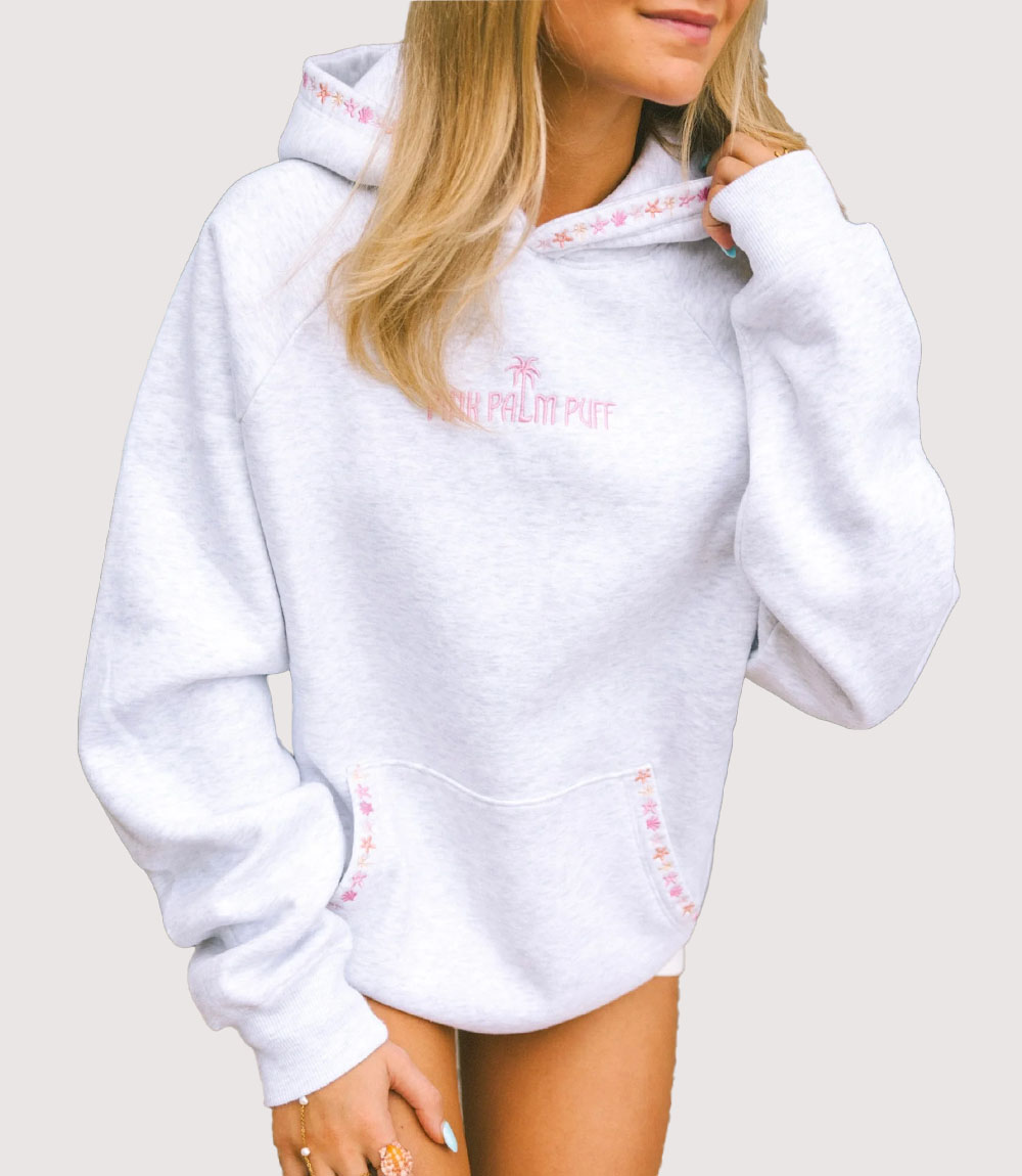 The Pink Palm Puff Chase the Sun Hoodie is a quintessential piece of coastal-inspired streetwear, designed for those who embrace a sun-drenched, tropical lifestyle. Set against a soft heather grey or off-white base, the garment features a massive, multi-textured back graphic that immediately captures the essence of summer. At knitedge we highlight this hoodie for its masterful use of “puff print” technology, which adds a tangible, three-dimensional depth to the vibrant pink artwork.